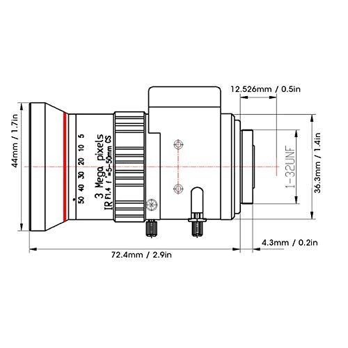 機能: 1。 5MPの高解像度レンズで、歪みの少ない被写体をより鮮明に観察します。 2。ズームレンズはFLを変えることで撮影範囲を変えることができ、構図に非常に役立ちます。 3。 1つのズームレンズで複数のプライムレンズレンズとして使用できるため、レンズ交換の時間を節約できます。 4。互換性が高く、ほとんどの防犯カメラに適用でき、より便利なように絞りを固定およびロックできます。 5。高品質のアルミニウム合金素材で作られており、丈夫で耐久性があり、安定した性能を発揮します。 仕様: アイテムタイプ:ズームレンズ素材:アルミニウム合金色:黒+赤ピクセル:5MP FL:5-50mm 相対絞り:1:1.4 画像サイズ:1 / 2.7in 1 / 3in マウント:CSマウント水平視野:1/2.7in51°-6.1° 1 / 3in45°-5.5°最小物体距離:1.5m 光学バック長(BFL):8.1-15.73mm 使用温度:-20℃-60℃絞り:手動絞り パッケージリスト: 1 x5MPズームレンズ