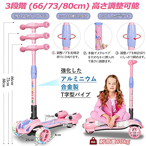 67i キックスクーター 幼児 子供用 3輪キックボード 4段階調節可能 2-10歳に向け キッズ スクーター 軽量 LED 光るホイール フットブレーキ付 ギフトに最適 (ライトピンク)