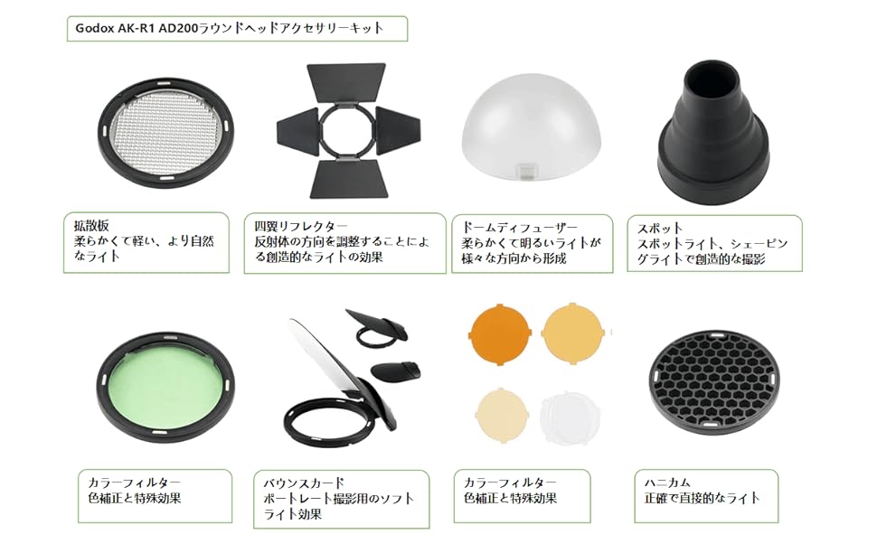 Godox AK-R1アクセサリーキットに含まれるもの: 遮光シャッター ハニーコームガードカバー ビームスヌート 調整可能なワンピースリフレクター 半円形の光拡散ボール半透明カラーフィルター カラーフィルター(緑、オレンジ、白、合計6個) パッケージ内容 1 * AK-R1キット 1 * PERGEARクリーニングクロス