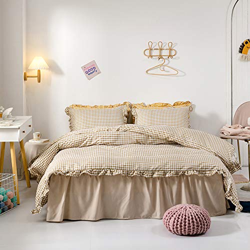 Ovege 布団カバー シングル 3点セット 掛け布団カバー ベッドスカート 洋式 枕カバー かわいい フリル付き チェック おしゃれ ベッド用 布団用 ベット 寝具カバー 姫系 ピーチスキン加工 北欧 安心 抗菌防臭 洗い替え速乾 (ベージュ*ベッドスカート, シングル・3点セット)