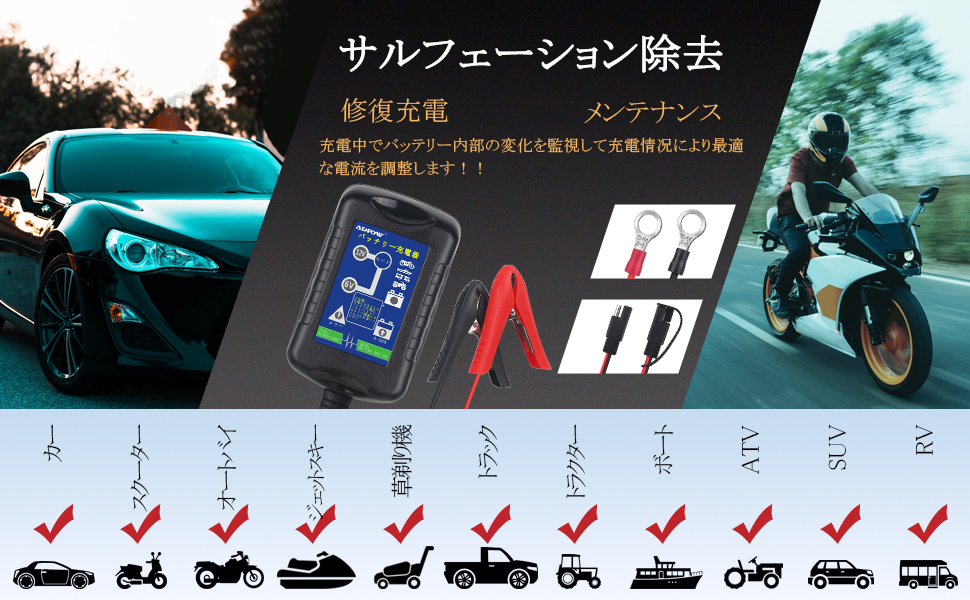 全自動4ステージ充電LED表示 ①「初期化」:充電器の起動してから自己検査します。正しく接続かを検査する段階です。 ②「バルク充電」:充電器の最高電流を使い、バッテリーを80%容量へ行われる段階です。 ③「アブソーブ充電」:徐々に満充電に向けて微弱な電流を流し、電器を過熱させない充電する段階です。 ④「フロート充電/メンテナンス充電」:リップル充電でメンテナンスを行わう段階です。同時に満充電段階です。満充電後は、接続したままでメンテナンスを行われるので過充電しません。 充電時間計算: バッテリー容量÷充電電流(本充電器は1.5A)=充電時間(H) 例:25AHバッテリー 25AH÷1.5A=16.7時間 ★注意:40AH以上のバッテリーも使用できますが、その場合は、満充電までかなり時間がかかりますので、予めご了承ください。