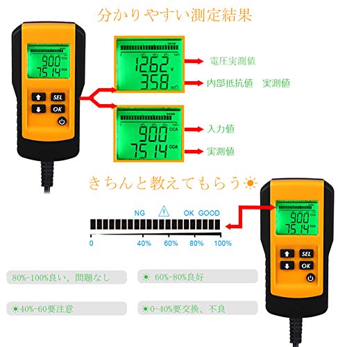 『操作簡単 安心安全利用』 クランプを接続してCCA値を入力してからテストを行いますので、非常な操作方法、だれでも利用可能。 それに、連続テストでもバッテリーに影響ありません。 バッテリーが良好か、不良かを教えてくれて、それに、バッテリー電圧低下の場合は、"B”との音と"LOW”とのマークで初心者でも一目でわかります。