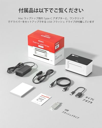ご注意: 日本のお客様がスムーズにご利用できるように、USBフラッシュメモリ(プリンタードライバー、ラベル デザインソフト内蔵)、感熱ラベル(テスト用)を入れておきました。予めご了承お願いします。