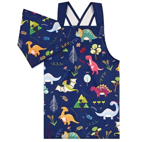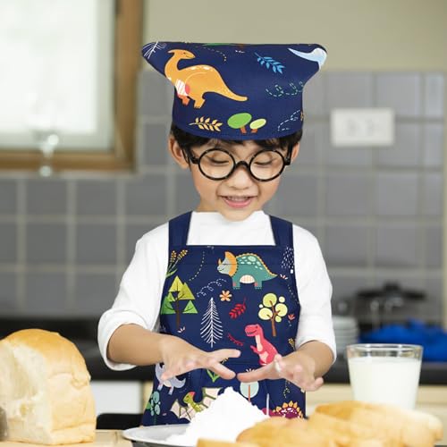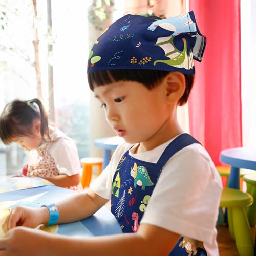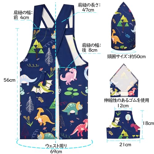 [Athbavib] キッズエプロン かわいい恐竜 ホワイト 三角巾付き ポケット付き 子供エプロン 前掛け 調節可能 50*60cm 防水コットン 男の子 女の子 幼稚園 小学生 手入れ簡単 キッチン お手伝い 家庭科 絵画 書道