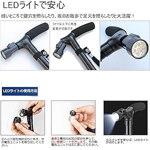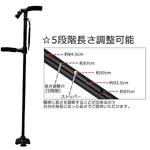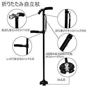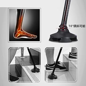 10°傾斜可能のデザインで、歩くことで重心が変わっても充分サポートできます。 杖先に安定の四つゴム支えがついて、1点支えにより十分安定で、雪の上にも砂利道にもバランスを崩れにくい。 手を離しても倒れない自立式で、必要しない時はお手軽にそばに置き済みます。 お買い物で選ぶ時、お金を払う時、家の鍵を開ける時等、自立式杖を利用して、手が自由になります。大便利です!