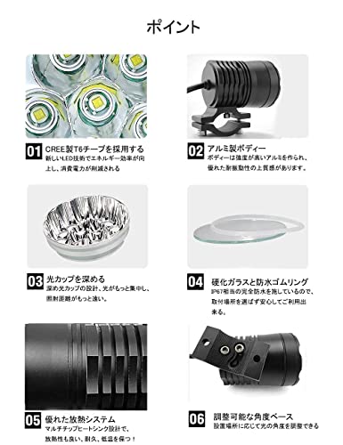 CREE製T6チープを採用する 新しいLED技術でエネルギー効率が向上し、 消費電力が削減される 光カップを深める 深め光カップの設計、光がもっと集中し、照射距離がもっと遠い。