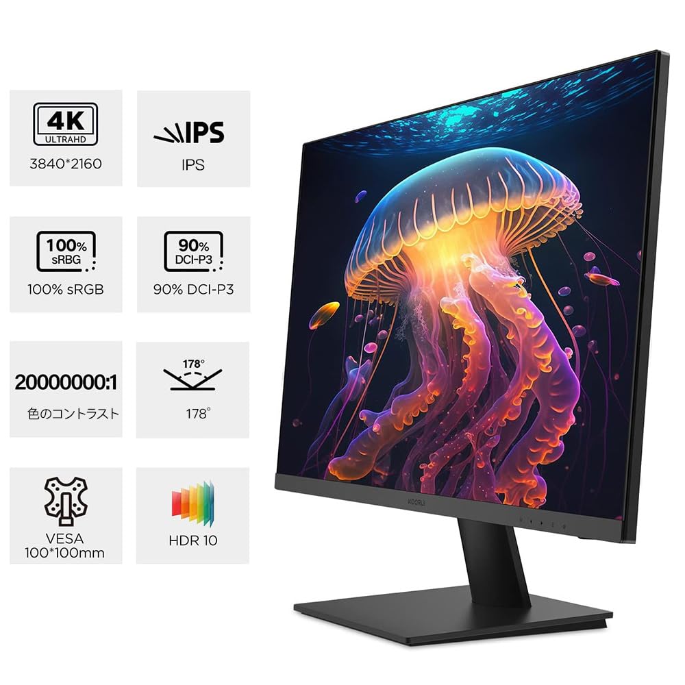 【華やかなビジュアル】27インチディスプレイ、IPSパネル、178°の広視野角により、どの方向からでも超鮮明なビジュアルが楽しめます。90%のDCI-P3色域カバー率は正確でダイナミックな色を提供し、UHD3840 *2160の解像度と100%のsRGBは鮮明で詳細な画像を生成し、臨場感のある体験を提供します。 【枠なしで目を保護する】UHD 27インチのコンピュータディスプレイは低ブルーライトのフリッカーフリー技術を採用して、スクリーンのフリッカーと有害なブルーライトの排出を減らして、たとえ長時間視聴しても、快適な視覚体験を与えることができます。pcディスプレイ3面フレームなし設計、多屏の仕事に適します 【人間工学に基づいたチルトとVESA互換性】4Kディスプレイスタンドは、すばやく取り付け取り外しができます。100 × 100mmのVESAスタンドにも対応しており、ディスプレイの移動や配置が簡単です。前傾5度、後傾20度で最適な視角を選択できます。