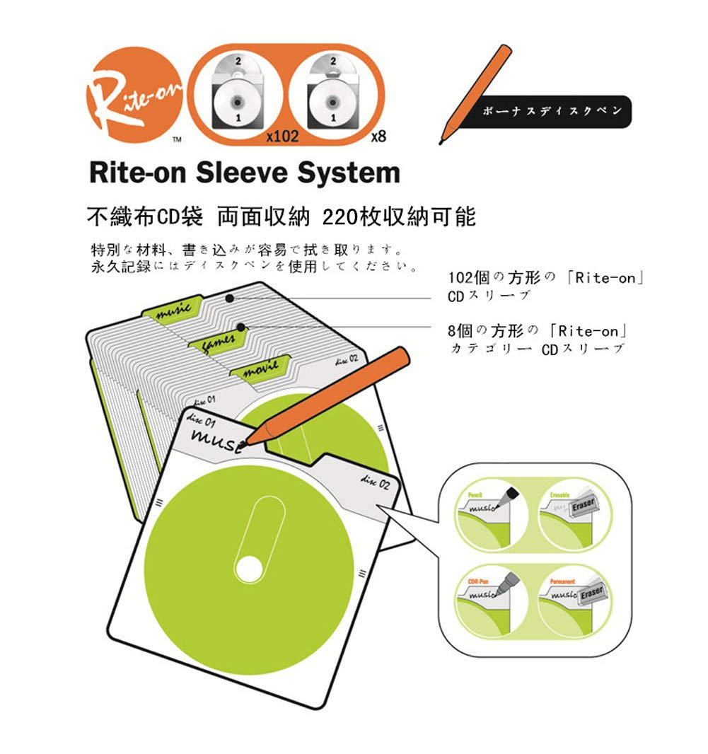 8個の方形カテゴリーCDスリーブと102個の方形の「Rite-on」CDスリーブ付きです。カテゴリーCDスリーブの端はインデックスカードとして、それぞれ緑、青、黄色と紫の4色に分けられており、ディスクの分類と迅速な探し出しに便利です。CDスリーブは両面収納可能で、合計220枚収納できます。CDスリーブごとには書き込む場所があって、探し出しに便利で、また特別な材料で作られており、鉛筆(或いはその他のボールペン)での書き込みが容易で拭き取ります。永久記録にはディスクペン(サービスディスクペン1本付き)をご使用ください。