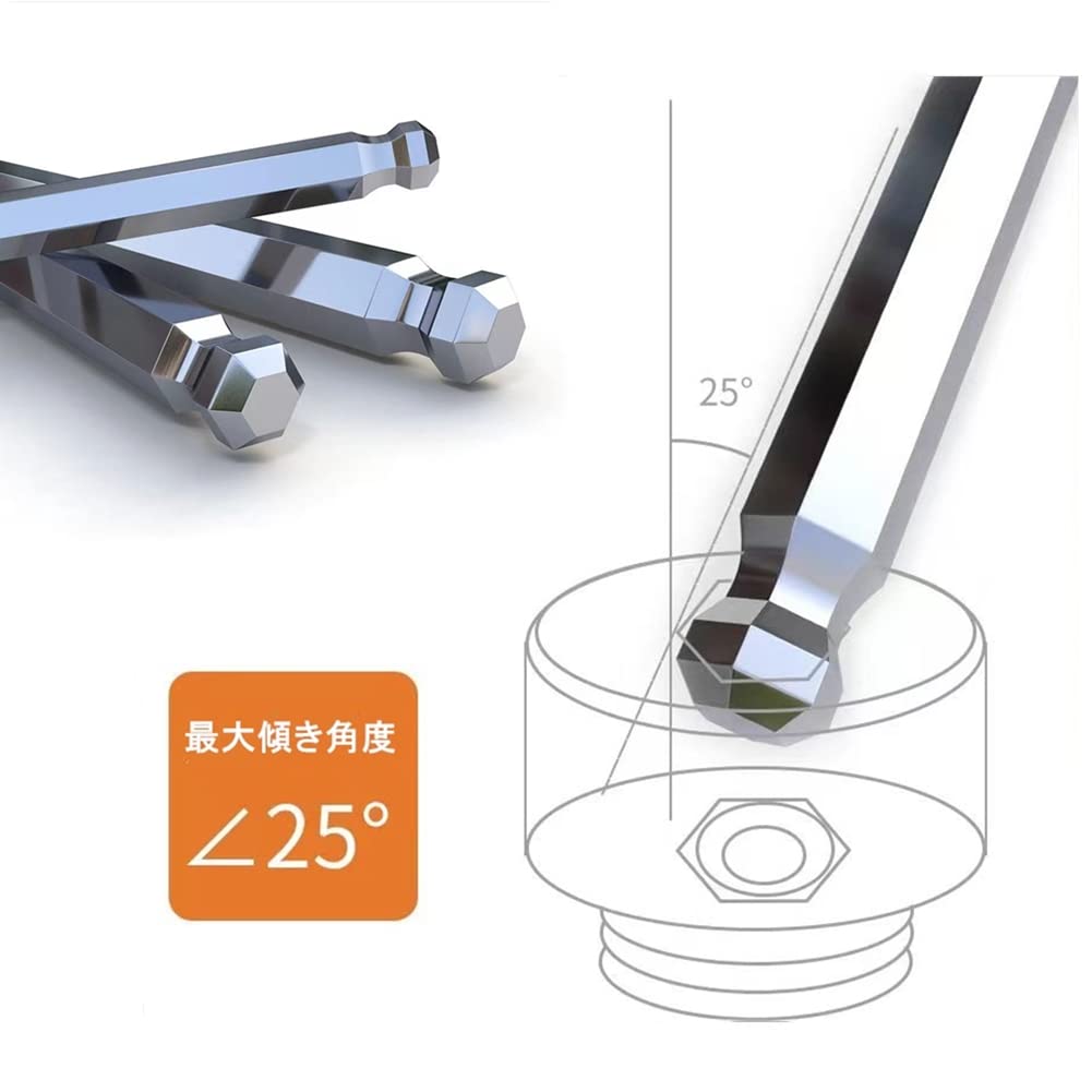 ボールポイント形状により、狭い場所や障害物のある場所でも、斜めから六角穴に挿入ができます。