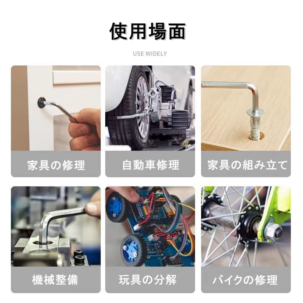 自動車整備用としてはもちろん、バイクメンテナンストルクレンチ 自転車 船舶修理、農機具修理、家具組み立てとしてなど、工場、ガレージ用、出張修理用工具、ご家庭用工具としても便利な、両用ヘッド六角棒レンチセットです。
