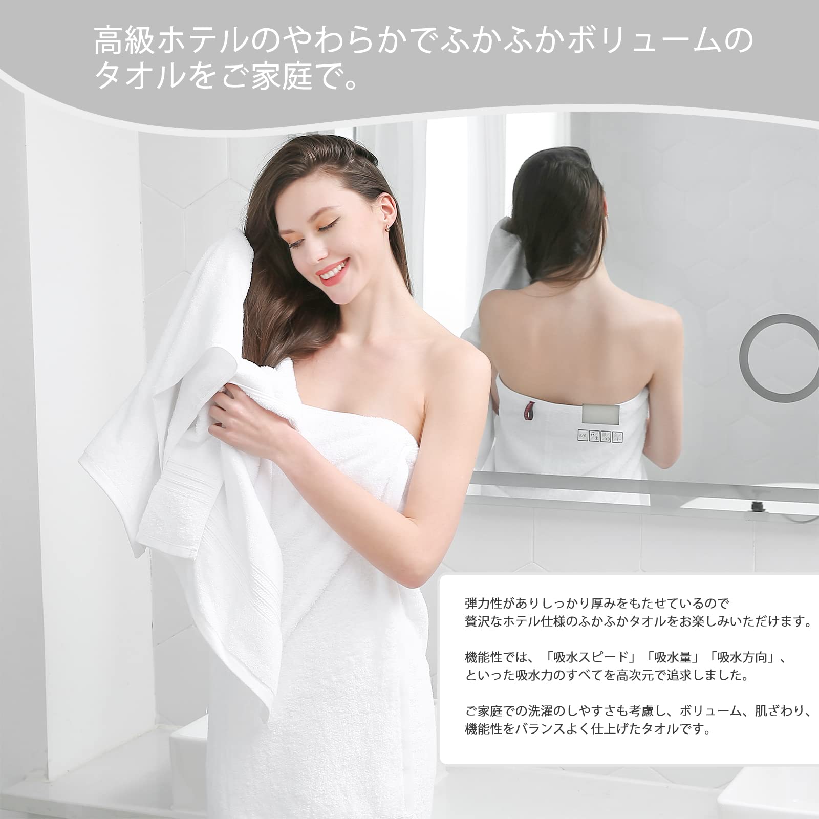 バスタオルを初めて使用する前に洗濯をしてください。また、バスタオルを洗濯するときには、柔軟剤や漂白剤を使用しないでください。柔軟剤は吸水性を低下させ、漂白剤は繊維を傷つける可能性があります。バスタオルを洗濯する際には、水温を40℃以下に設定し、手洗いもしくは洗濯機の弱い水流で優しく洗ってください。