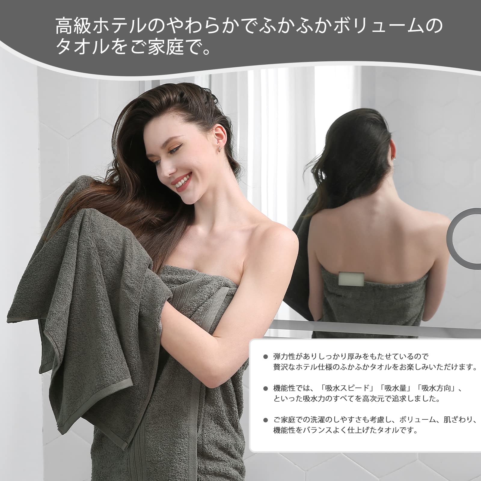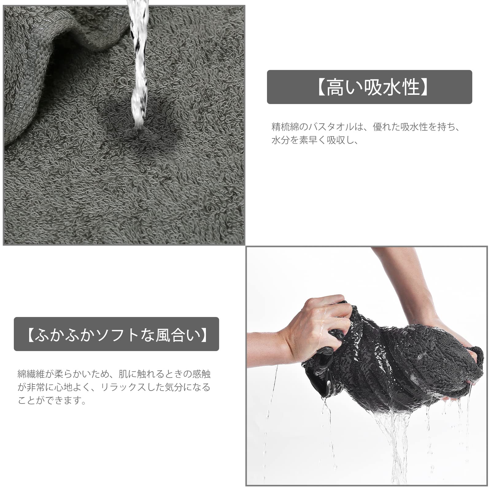 当社のバスタオルは、他の普通のバスタオルと比べて、綿糸が細く、よりふんわりとした質感があります。肌に優しく、吸水性が高く、バスタイムに最適です。