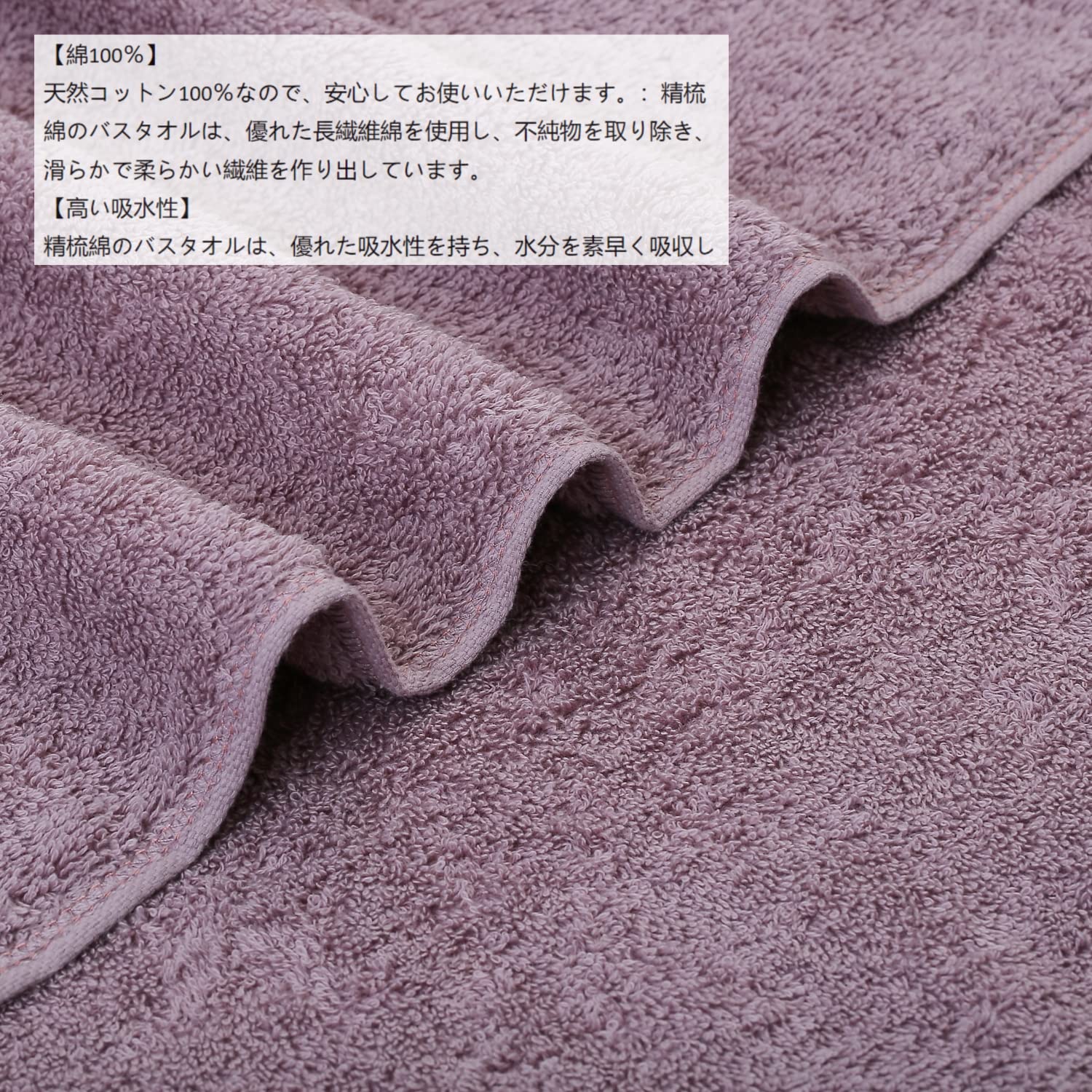 当社のバスタオルは、他の普通のバスタオルと比べて、綿糸が細く、よりふんわりとした質感があります。肌に優しく、吸水性が高く、バスタイムに最適です。