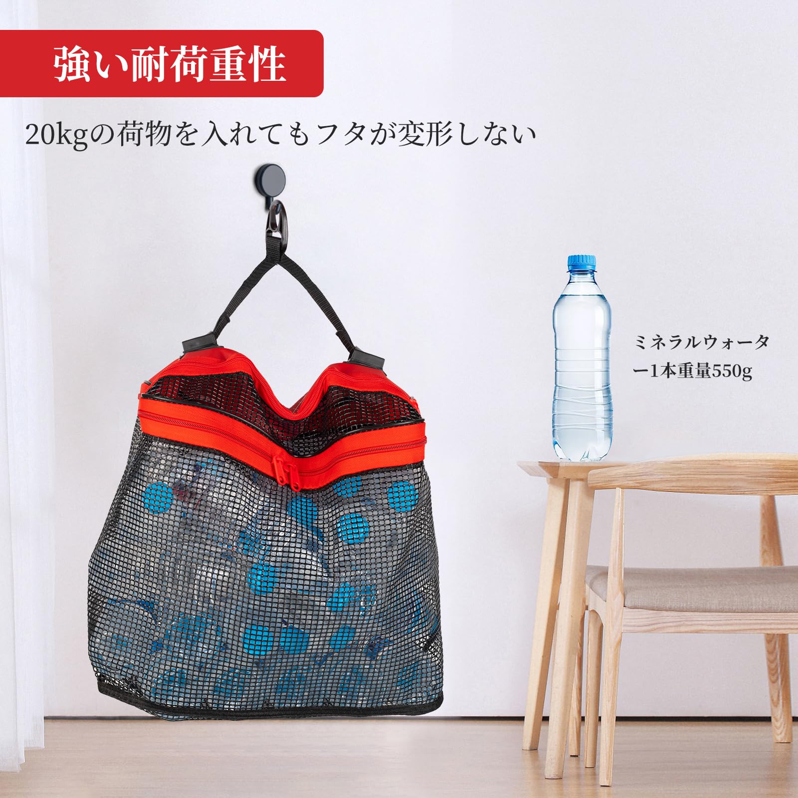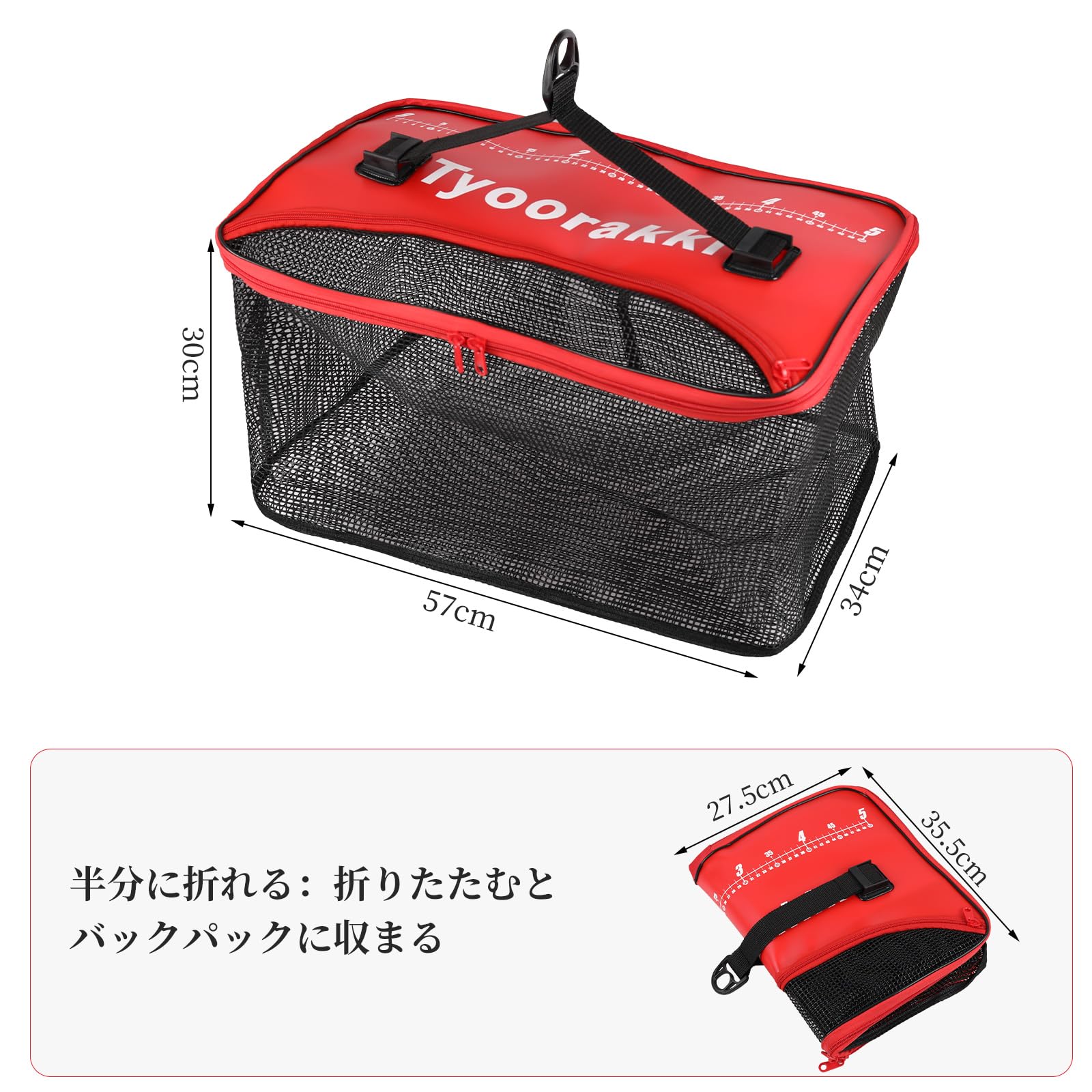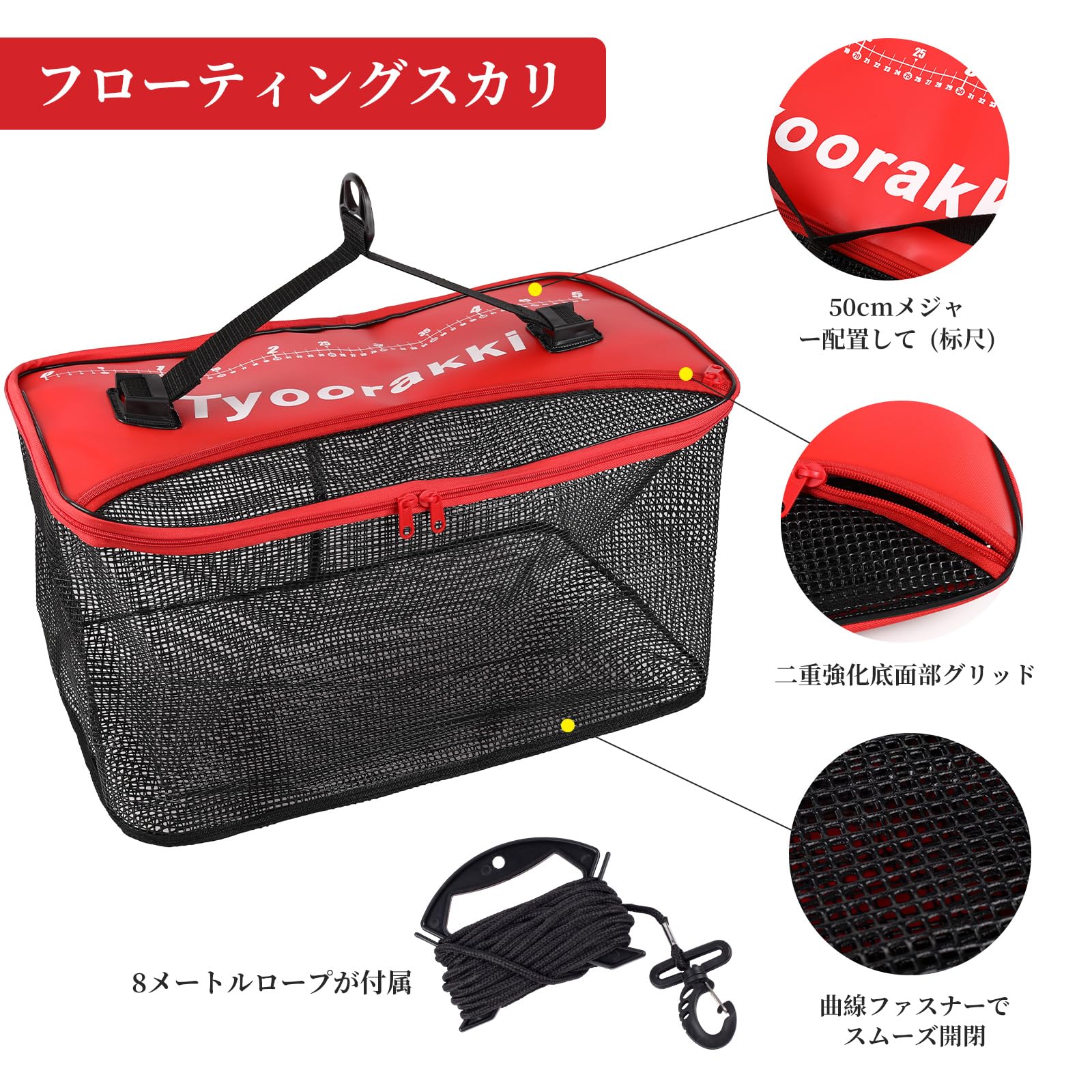 ネットの素材は耐久性が高く、劣化しにくいEVAという素材です。フタにウレタン素材を採用し本体自体が水面に浮く仕様、二重強化底面部グリッド、内層に耐摩耗性ロープ、外層に弾性ラテックスを使用