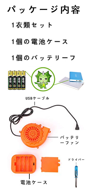 恐竜のボディの部分は、エアーポンプで空気を入れてるので、軽量!動きやすくパレードなどの移動にも◎ 4 * 1.5V単三電池で駆動されるエアーポンプで急速に膨張します。(※電池は付属していません) 着用方法: 1.モバイルバッテリーなどの外部電源を繋ぎ。単三電池4本が必要です、電池を入れてからすぐ使えます。(電池は付属してません) 2.扇風機のバッテリーパックをズボンやベルトなどにクリップして。 3.恐竜服を着る 4.空気を漏れないようにチャックをしめる 5.スイッチをオンし、膨らせる ●お使いのモニターにより色の映り具合が異なる場合もございます、ご了承の上お買い求めください。
