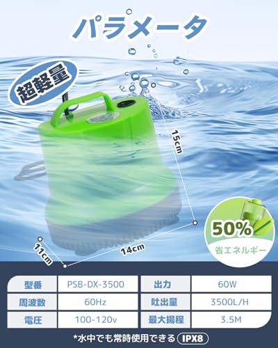 Onlit 水中ポンプ 排水ポンプ 循環ポンプ 底部入水式 最低水位0.5cm 吐出量3500L/H 最大揚程3.5M 60W 100v 60Hz 海水用 電動 清水用 家庭用 ノズル/2mホース/金属クランプ/フィルター/防振吸盤付き 水槽/水耕栽培/庭の灌漑/プール/お風呂 (PSB-DX-3500 60Hz)