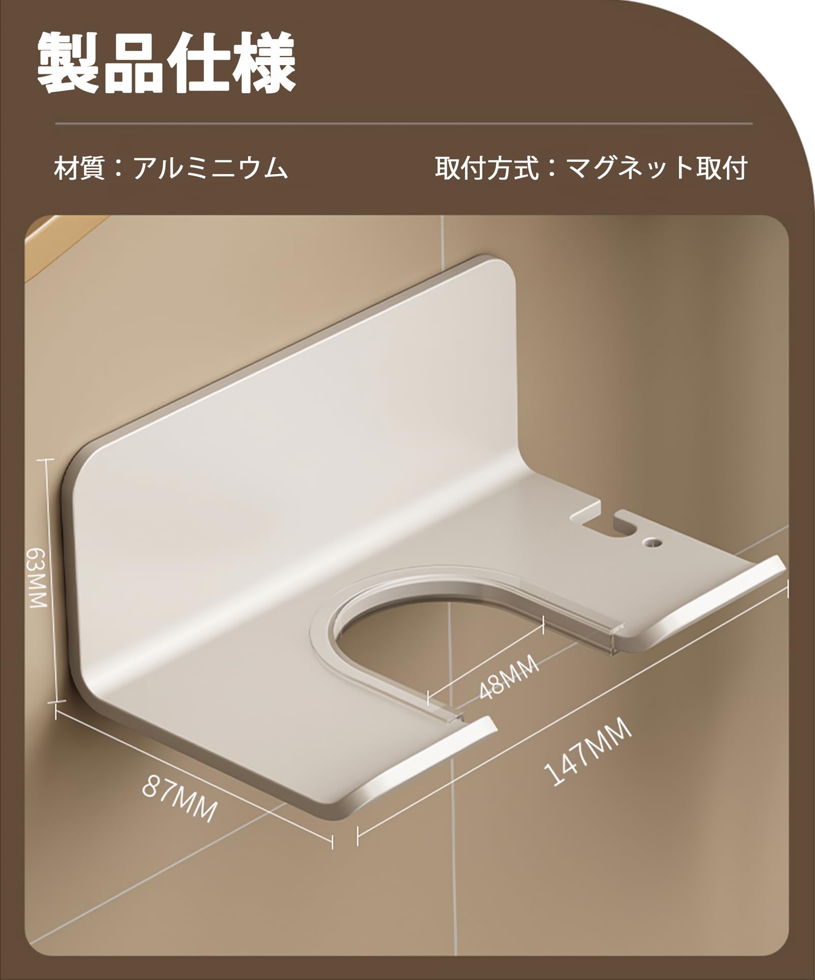 このドライヤー置きは、防食・防錆効果あるアルミニウム合金で作られています。