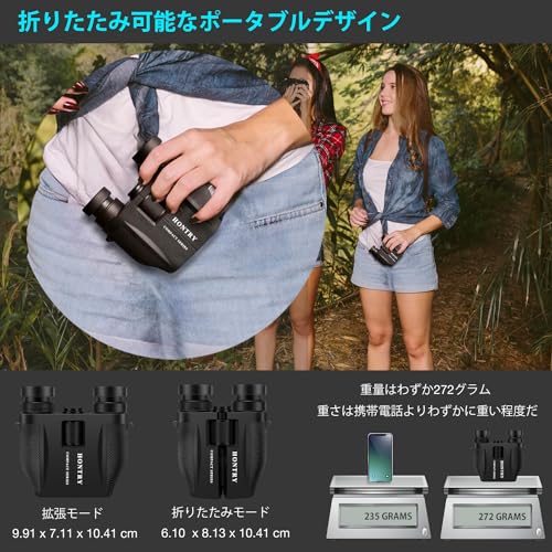 携帯電話より少し重いくらいです。双眼鏡なのに、持っているのをほとんど感じないほどの軽さを想像してみてください。HONTRY双眼鏡は、携帯性を重視して設計されています。一般的なスマートフォンよりもほんの少し重たいだけで、体積もほぼ同じです。