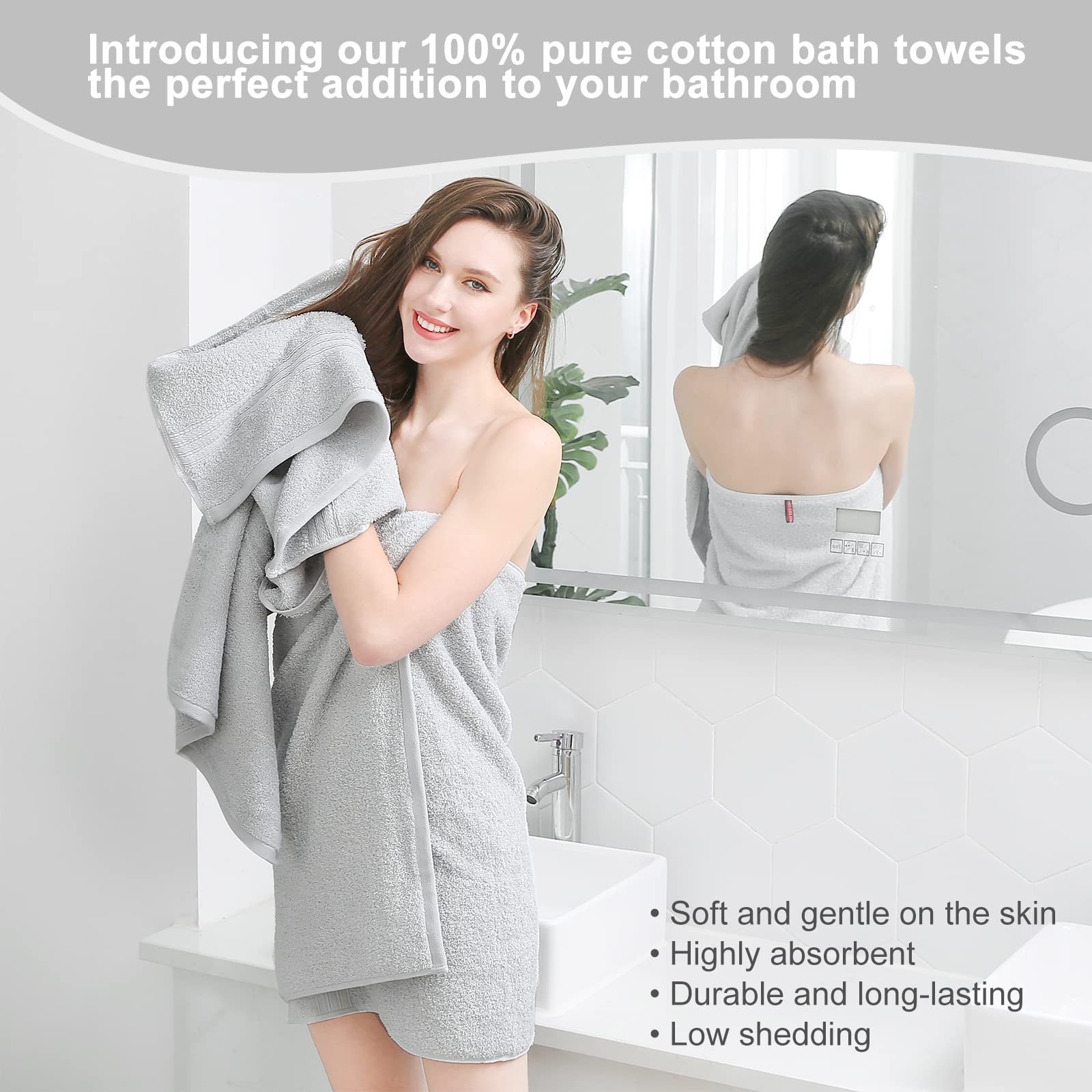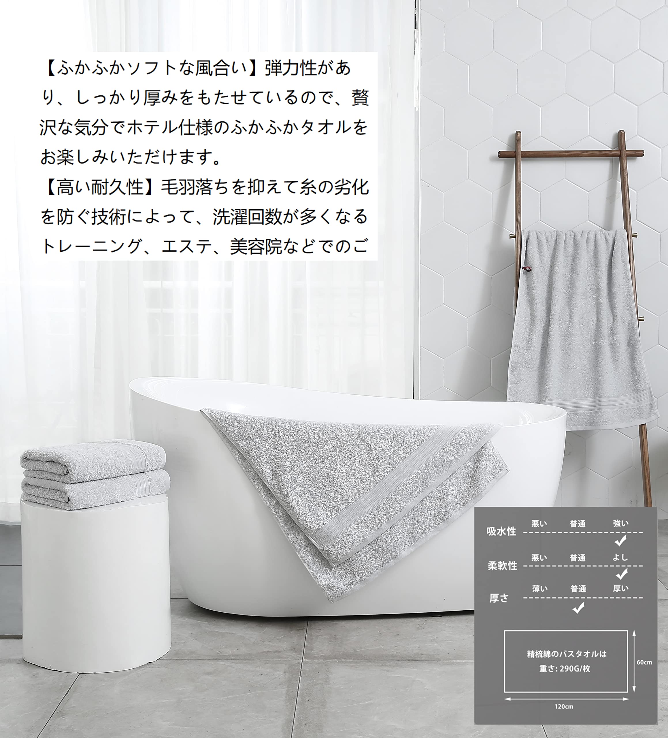 100% 綿 4枚 ホテルスタイル バスタオル セット タオル コットン 人気 ふわふわ の肌触り 吸水 (バスタオル, ライトグレー)