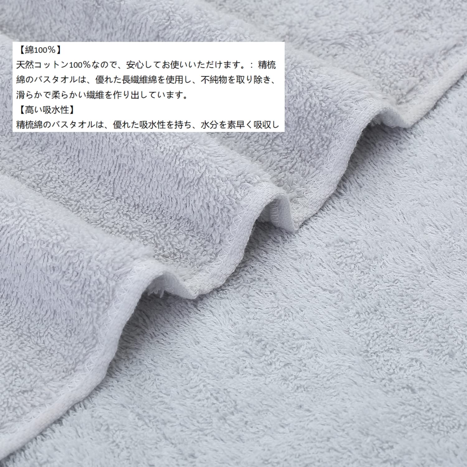 当社のバスタオルは、他の普通のバスタオルと比べて、綿糸が細く、よりふんわりとした質感があります。肌に優しく、吸水性が高く、バスタイムに最適です。