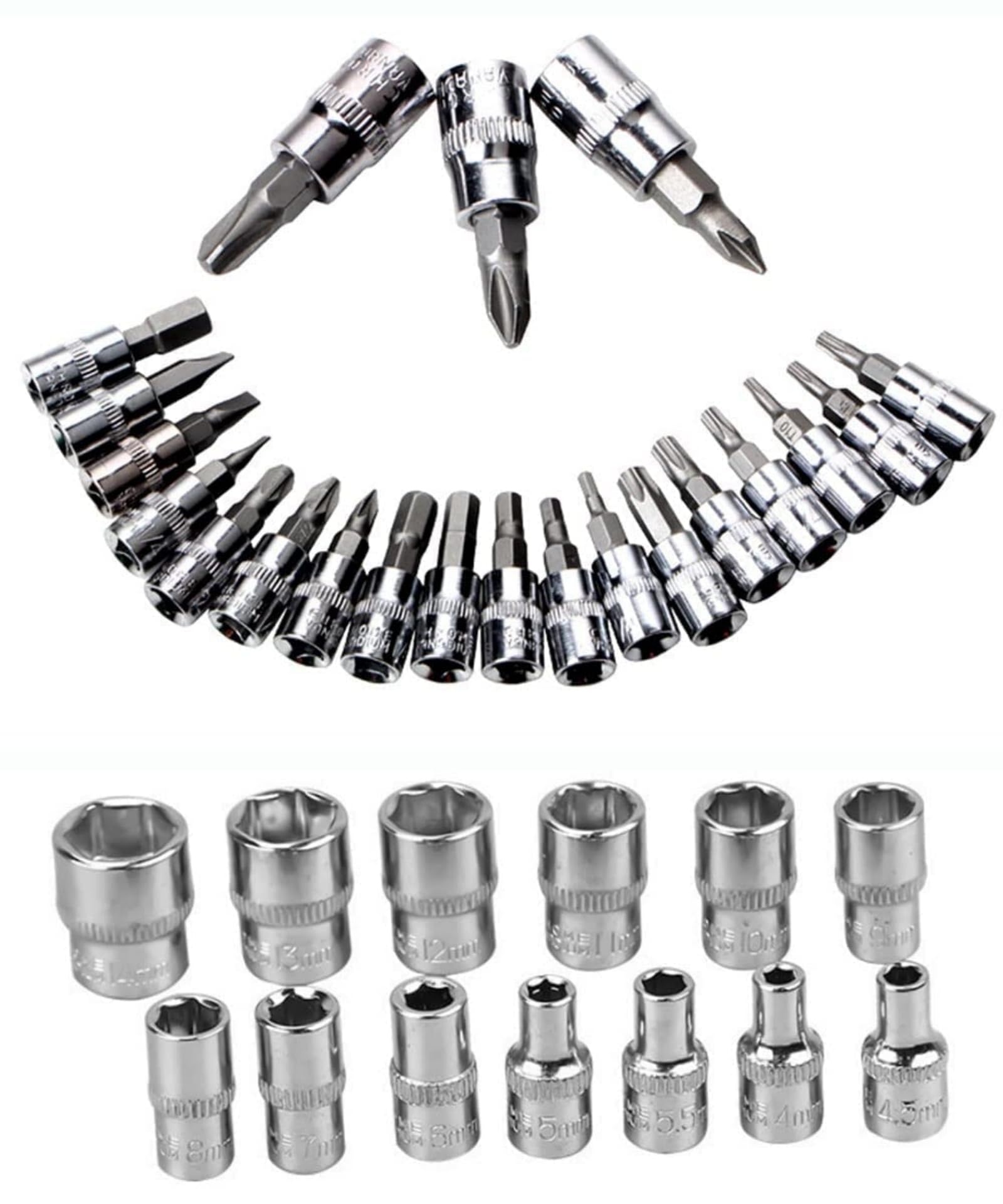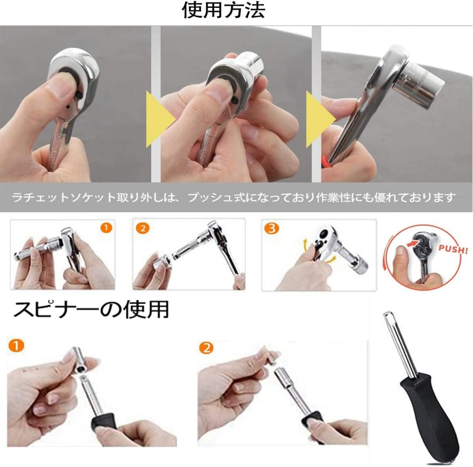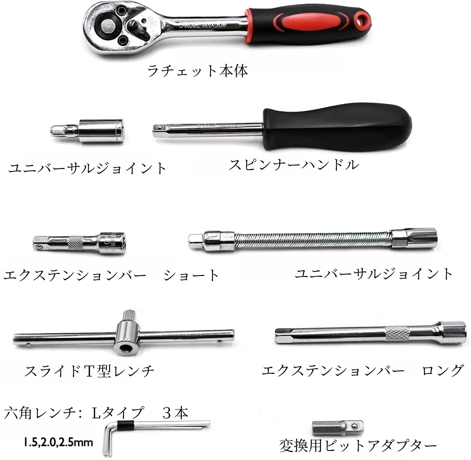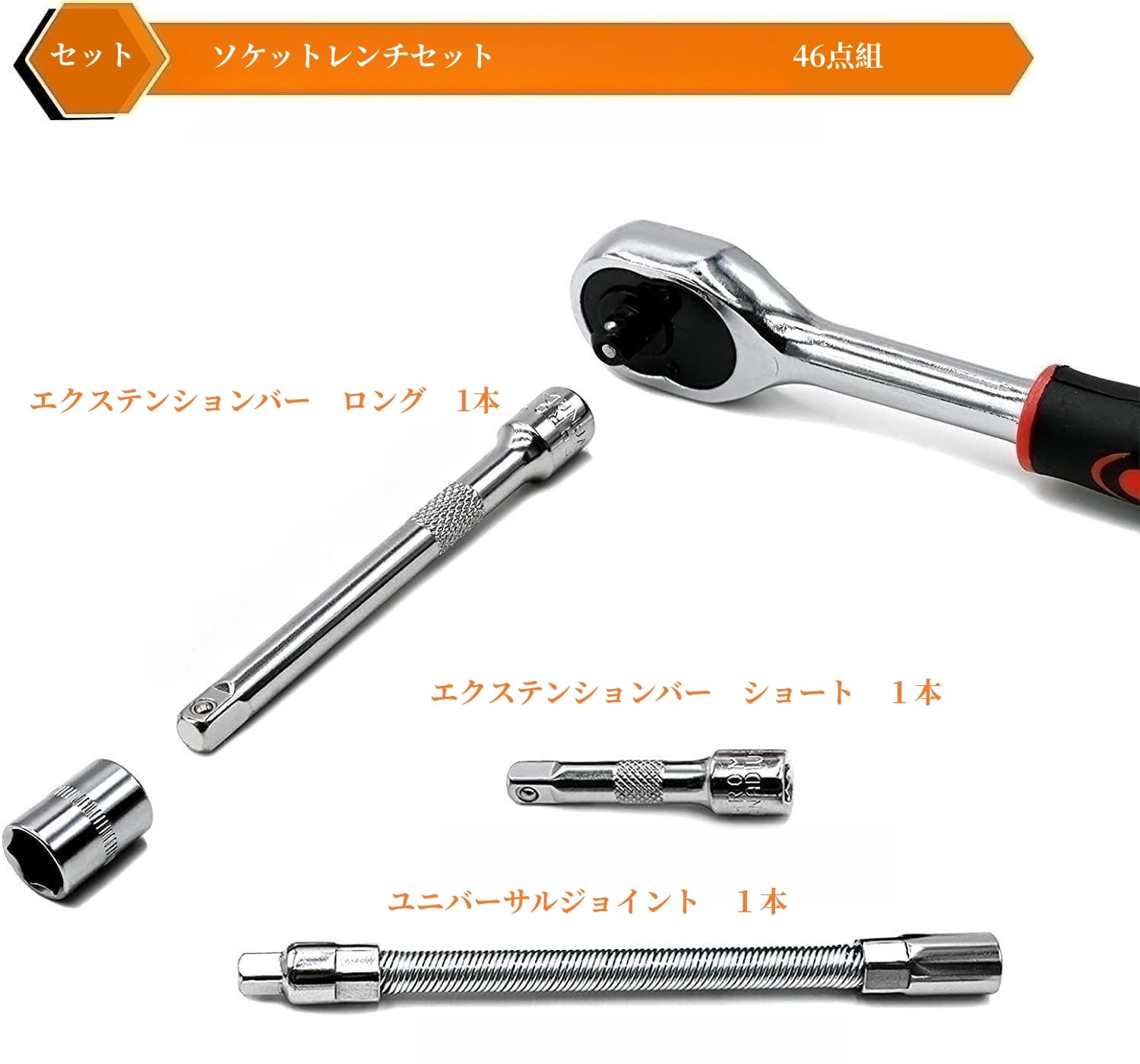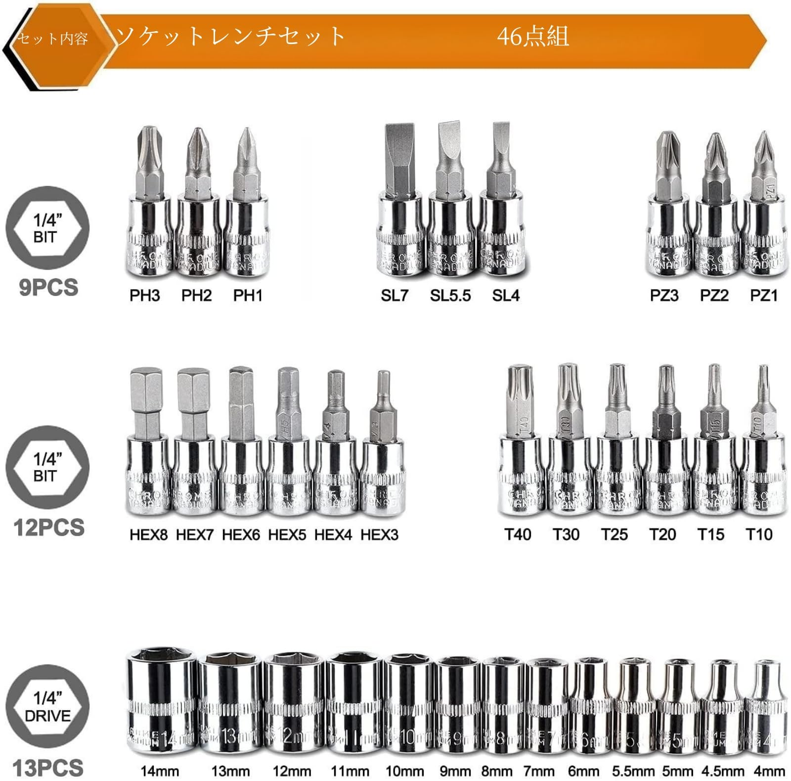 ソケットレンチセット 46点組 ラチェットレンチ 差込角6.35mm(1/4") 六角ソケット バイク ソケットレンチ 車やバイク整備用工具