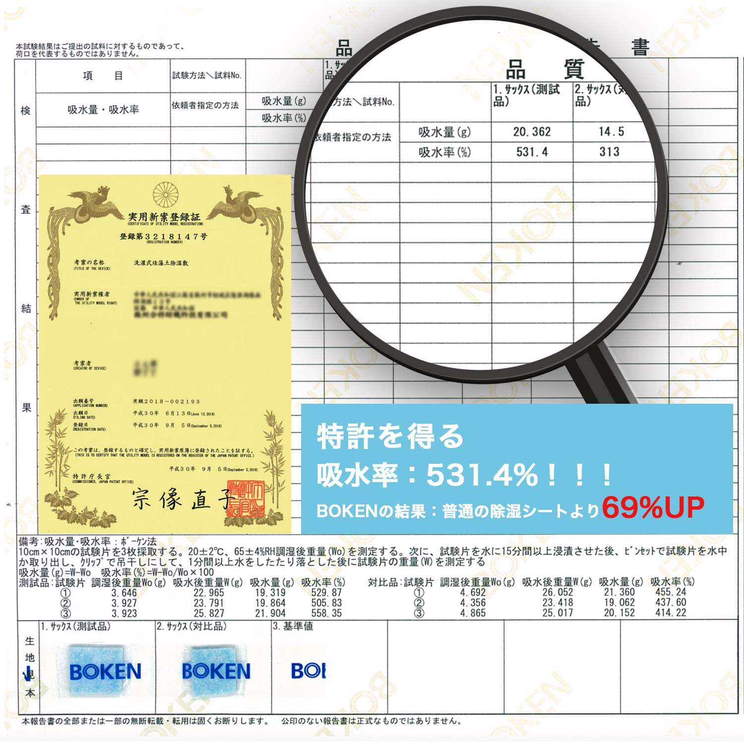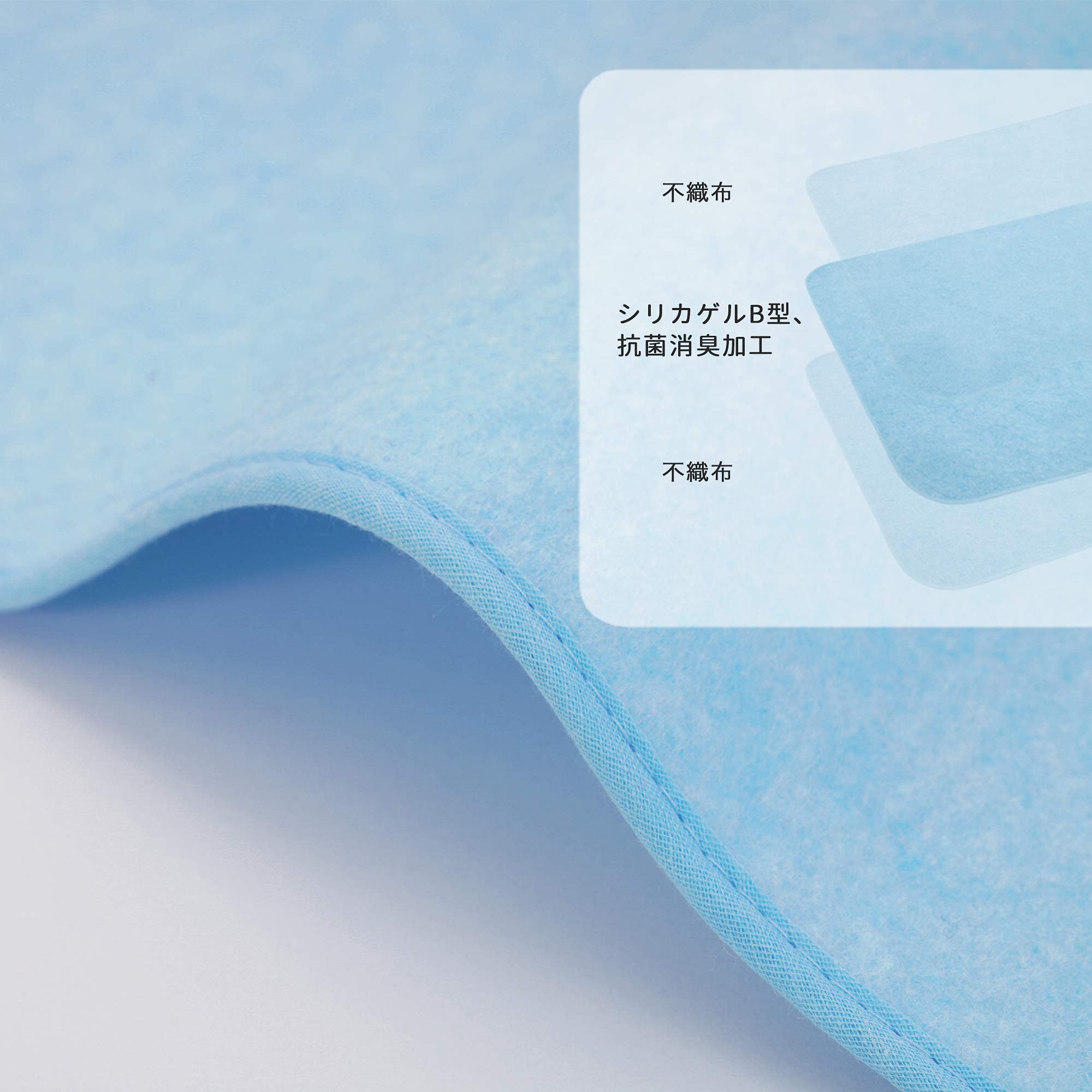 側生地不織布の間にシリカゲルB型をしっかり固定されます、更に消臭加工があります。耐摩擦、耐洗いとともに吸湿性も実現できます。ジメジメから救われます。