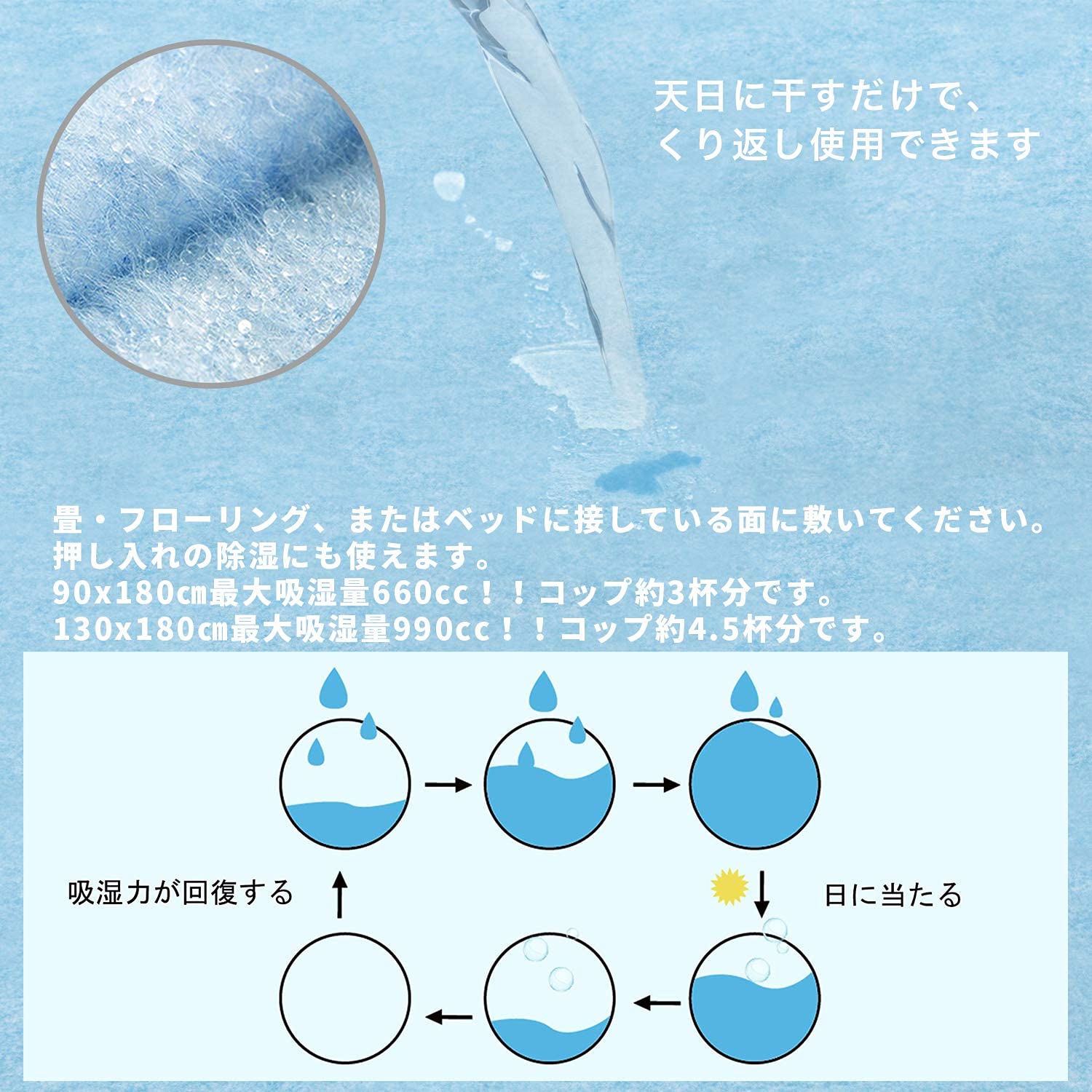 【日本特許品】除湿シート 除湿マット 寝具用 防湿 防ダニシート 吸水シート 洗える 結露対策 調湿センサー付き 防カビ 防ダニ 消臭 90*180cm ライトブルー