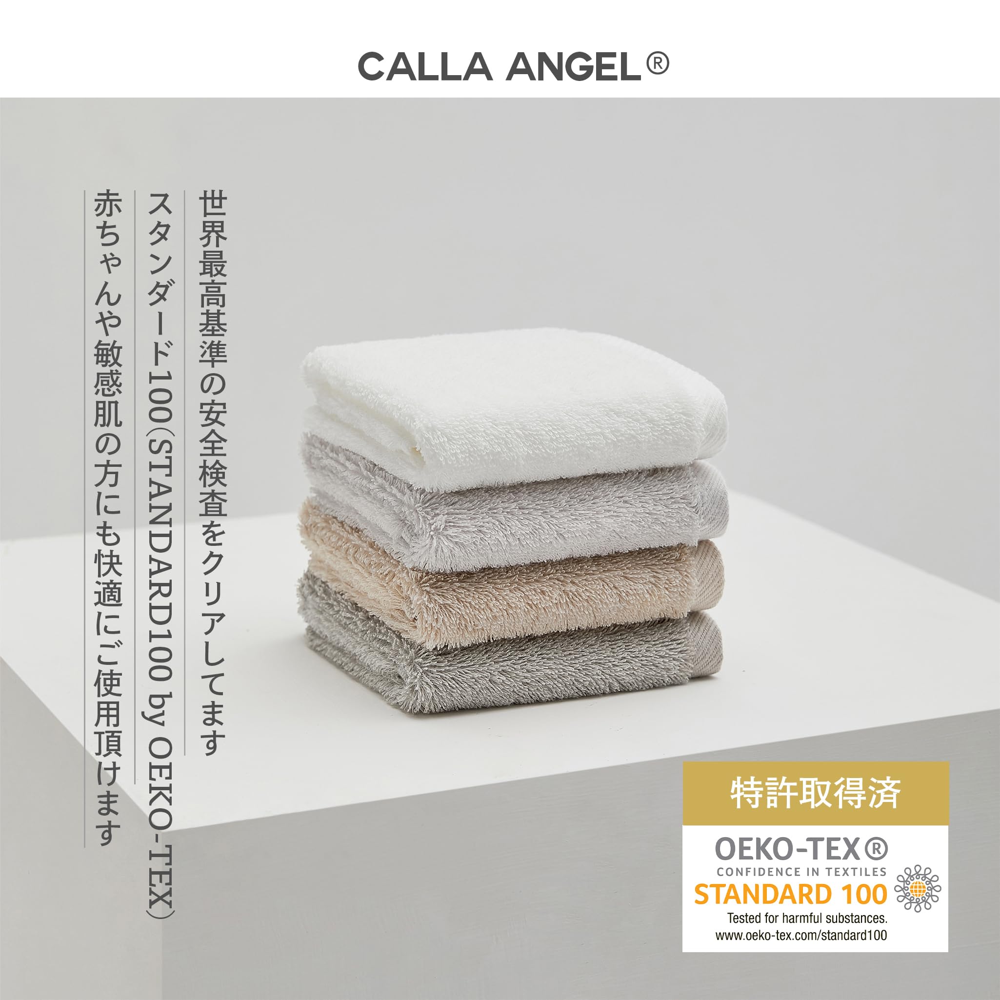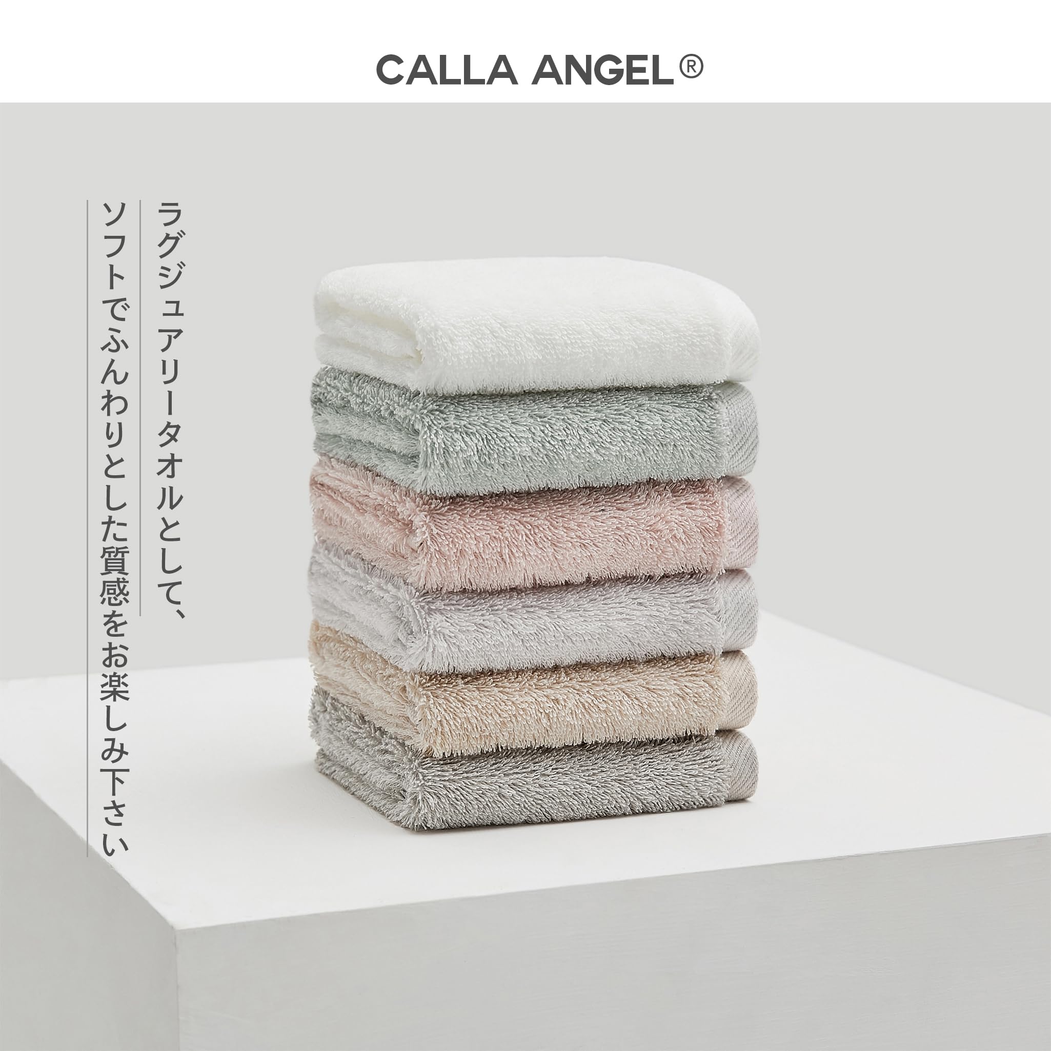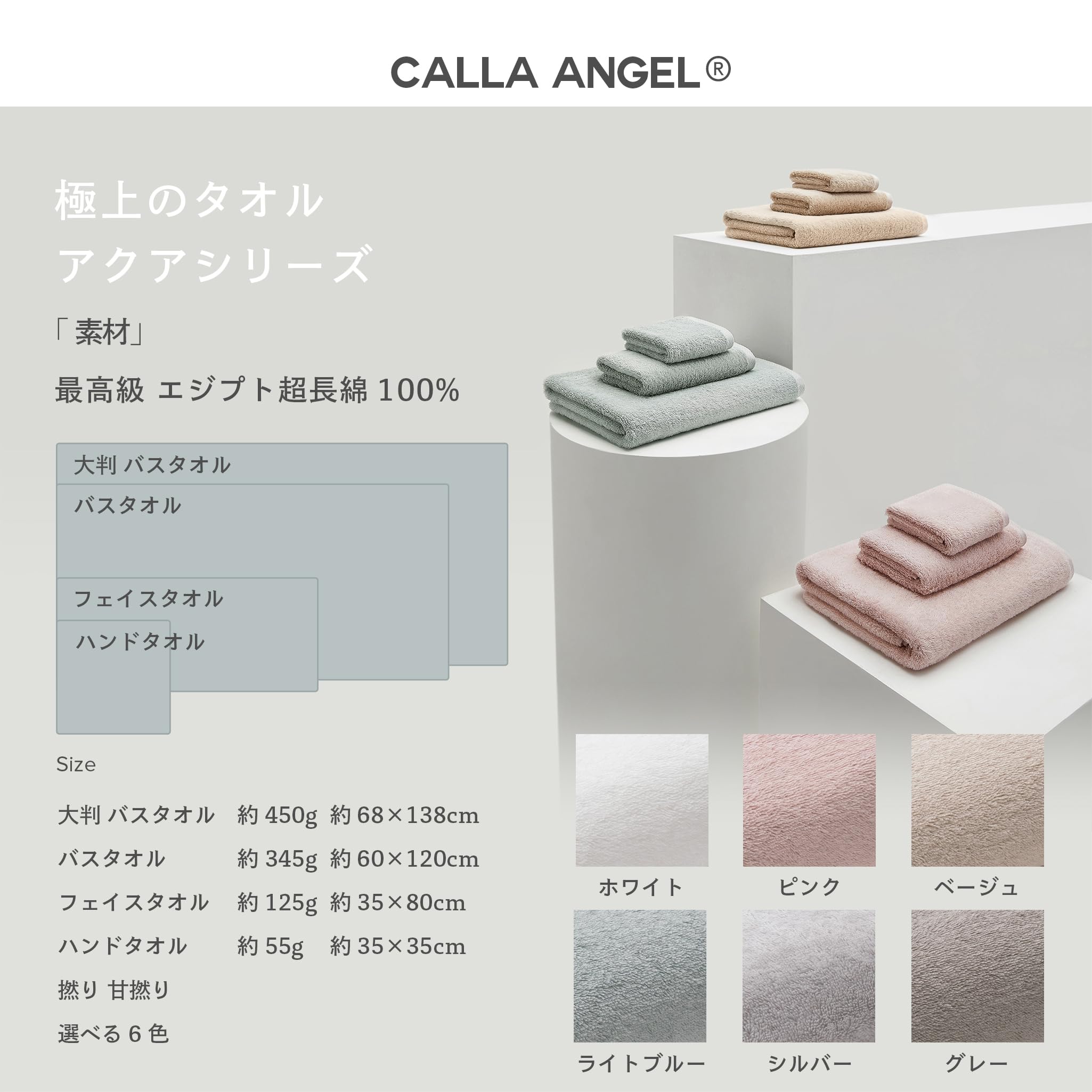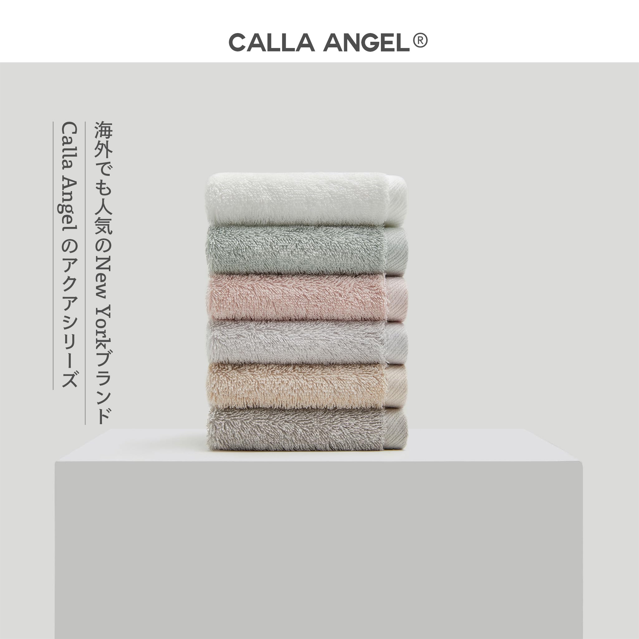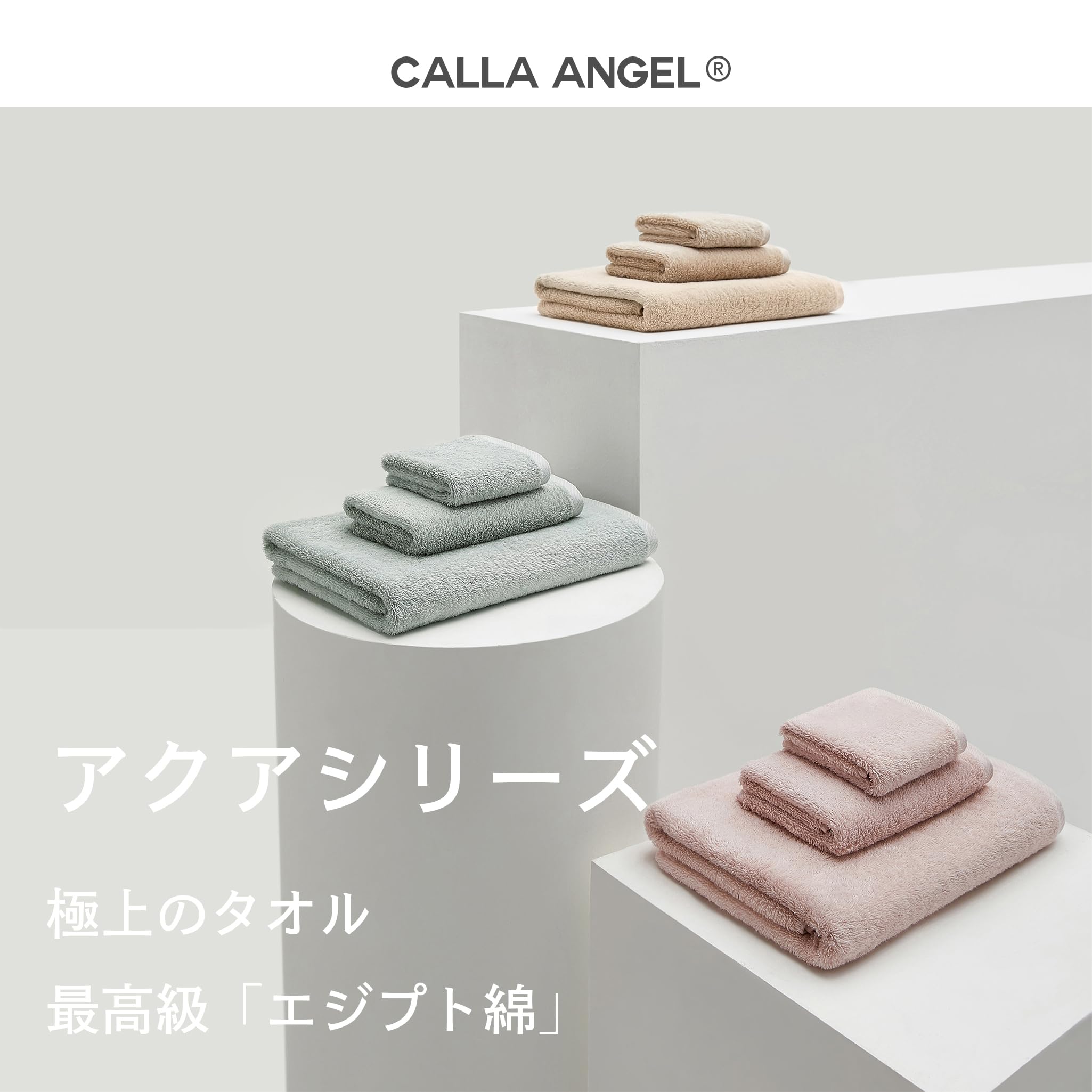 Calla Angelの大人気のシリーズ「アクア」、吸水性の高いたっぷりと贅沢なパイルの長さを保ちながら、しっとりと柔らかな肌触りを実現しています。
