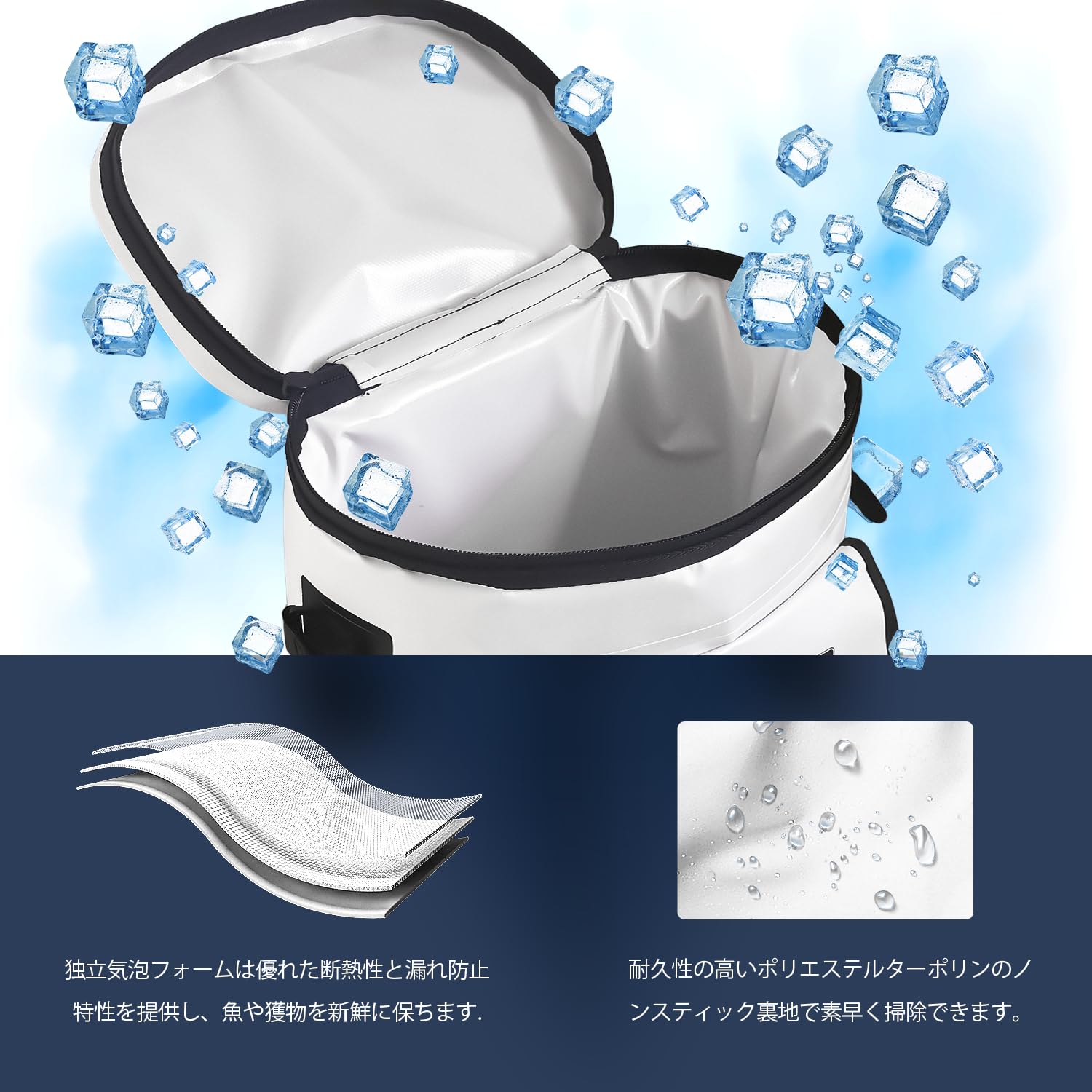 防水性と漏れ防止:漏れ防止裏地は熱溶着された縫い目を備えており、厄介な漏れを防ぎ、臭いや汚れから効果的に保護します。また、穴あき防止素材により、このフィッシュクーラーバックパックのお手入れが簡単になります。