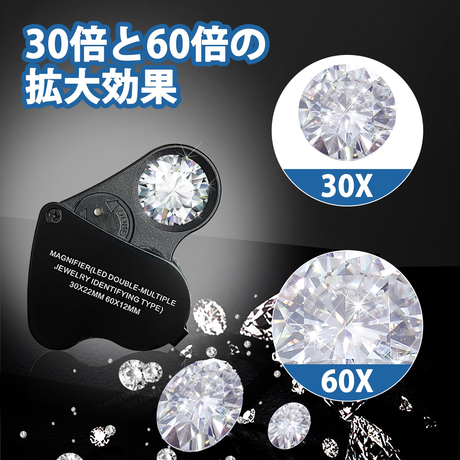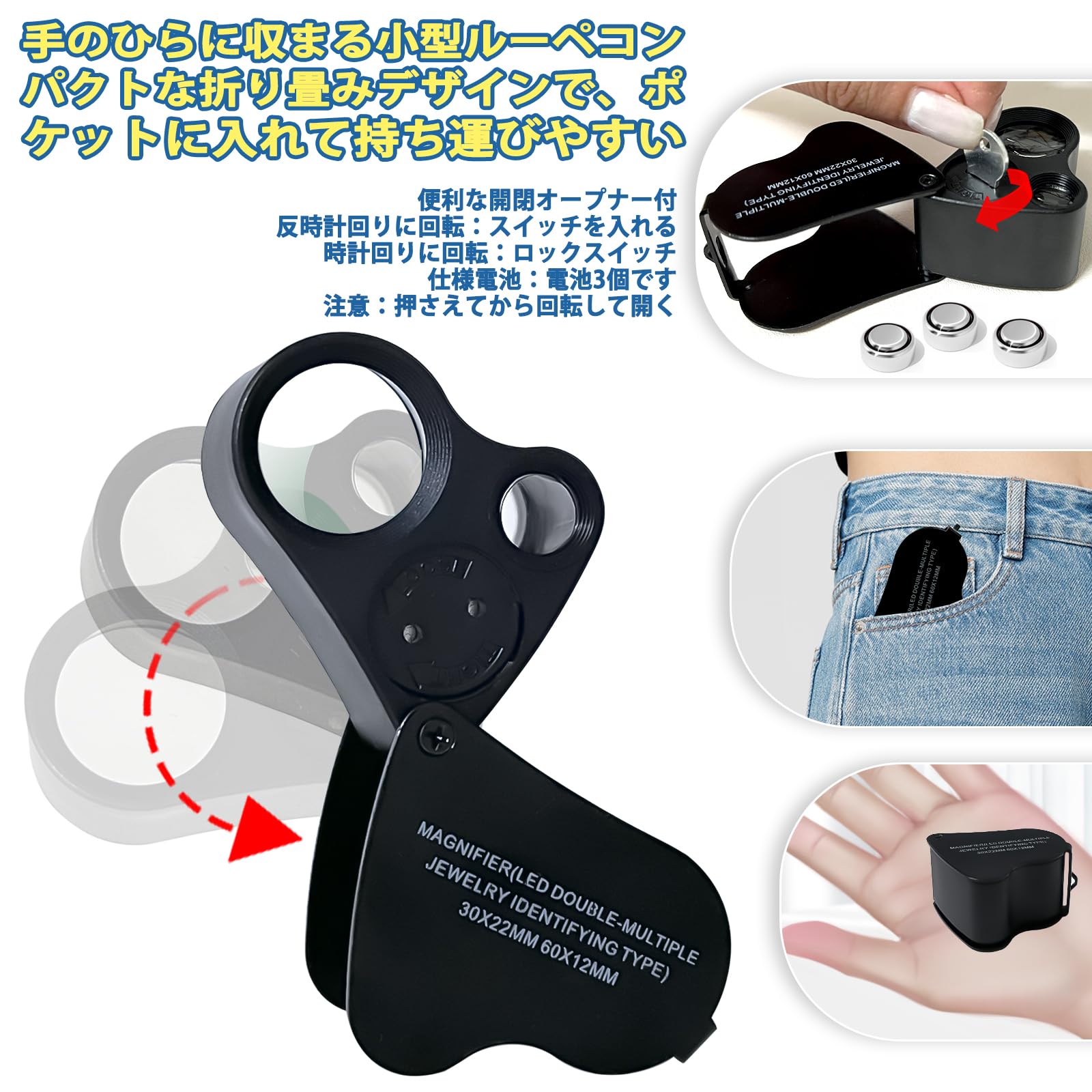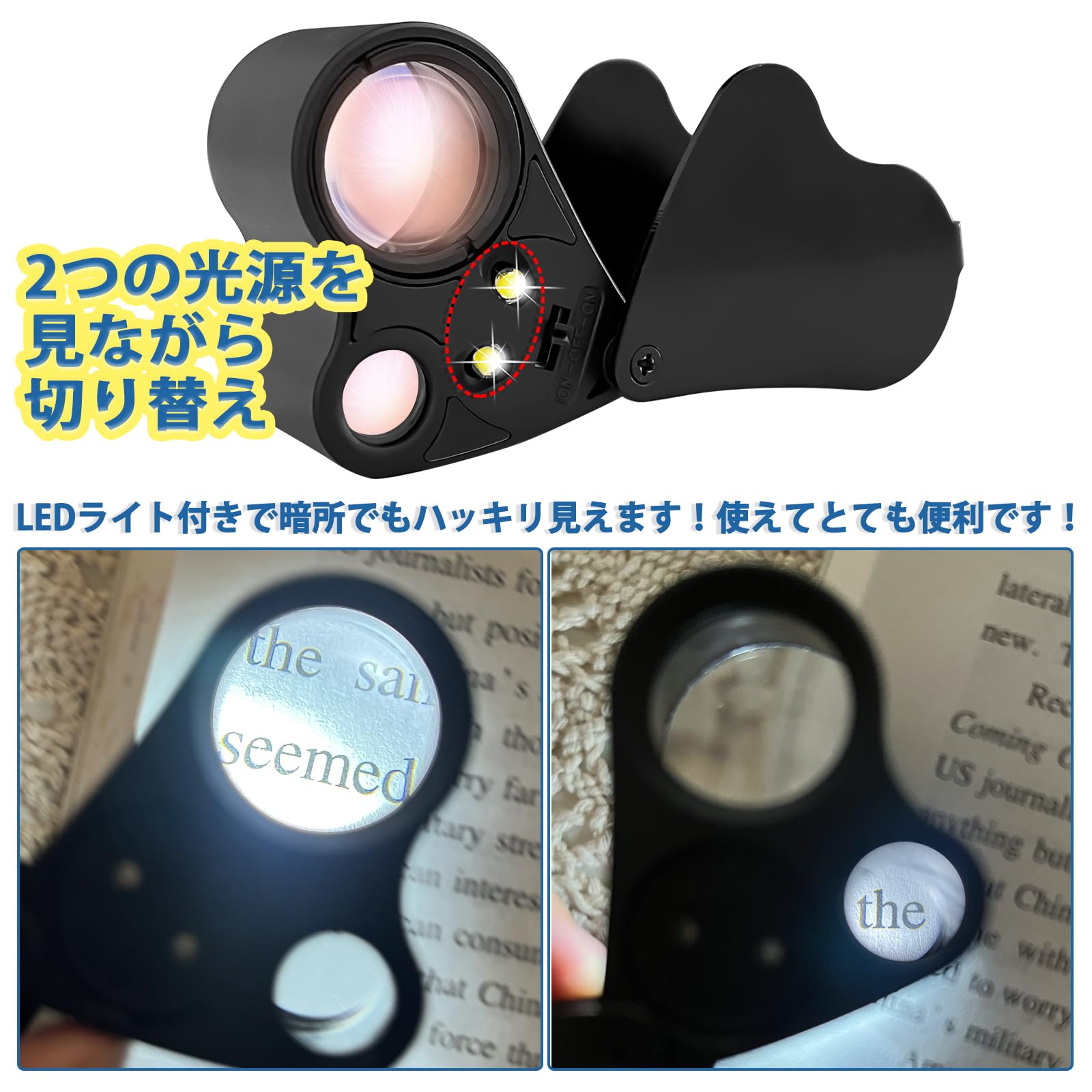 2種類レンズ ルーペ LED ライト付き 折りたたみ式(ブラック)