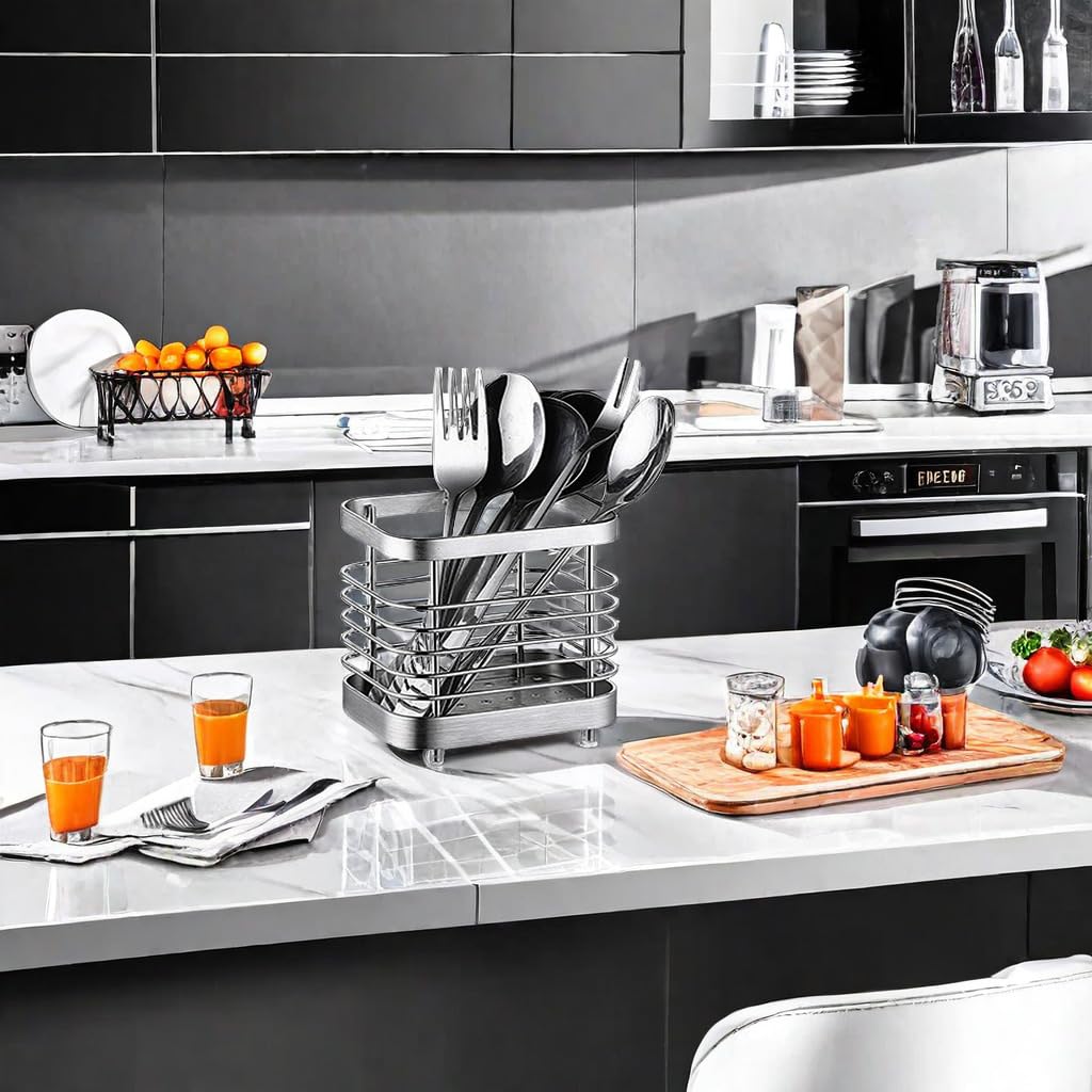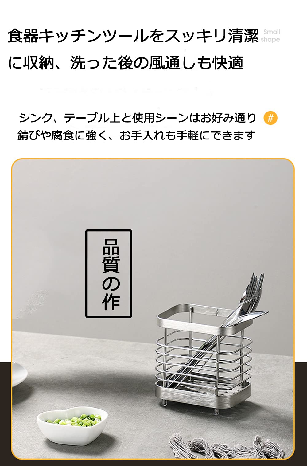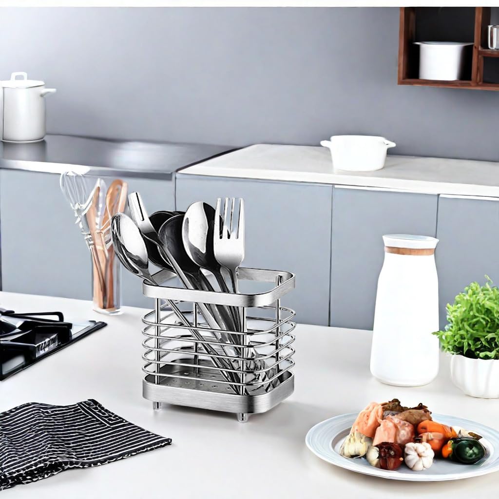 キッチン用品を整理するためのステンレス製のカトラリースタンドです。箸、スプーン、フォークなど様々な食器を収納できます。