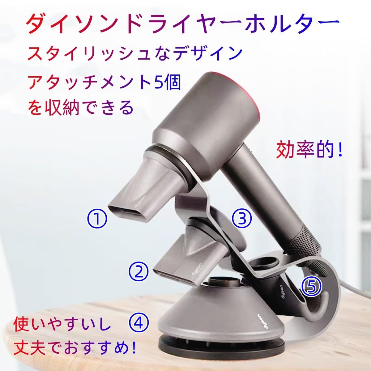 スタイリッシュな5イン1のデザインデザインにマイナスイオンとインテリジェントヒートコントロールという高い機能性を備えたダイソンのヘアドライヤーを愛用している方におすすめの、スタイリッシュなドライヤースタンドです。