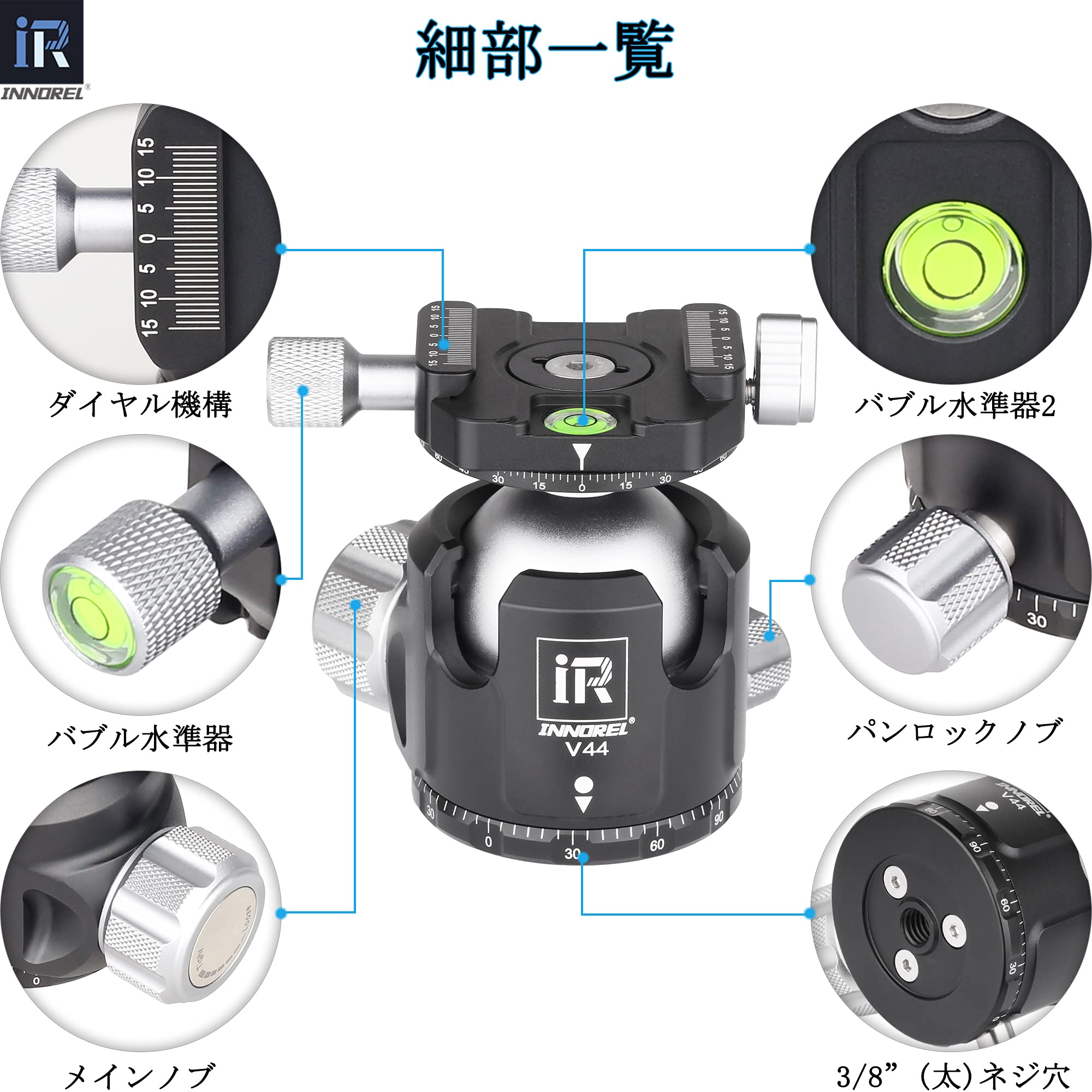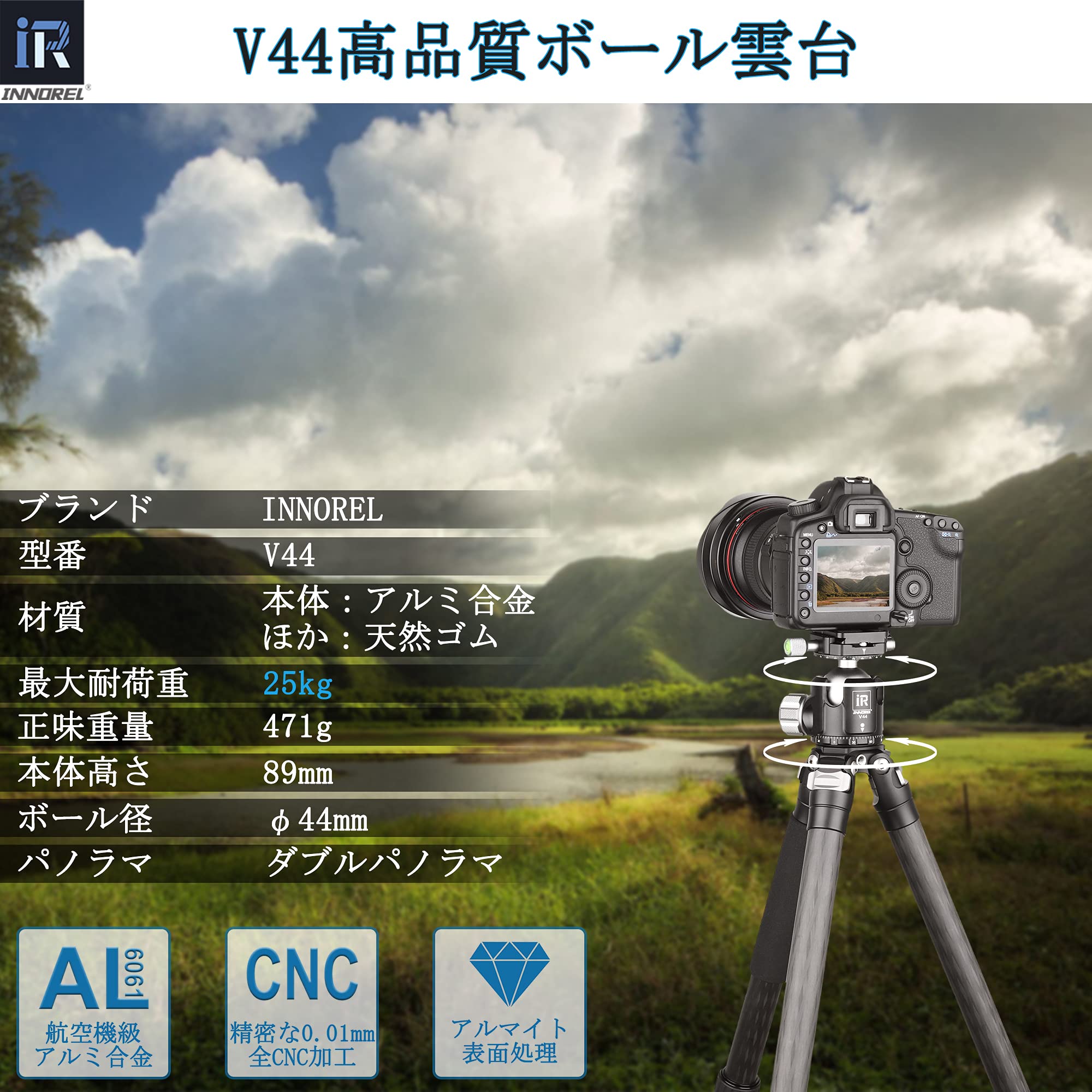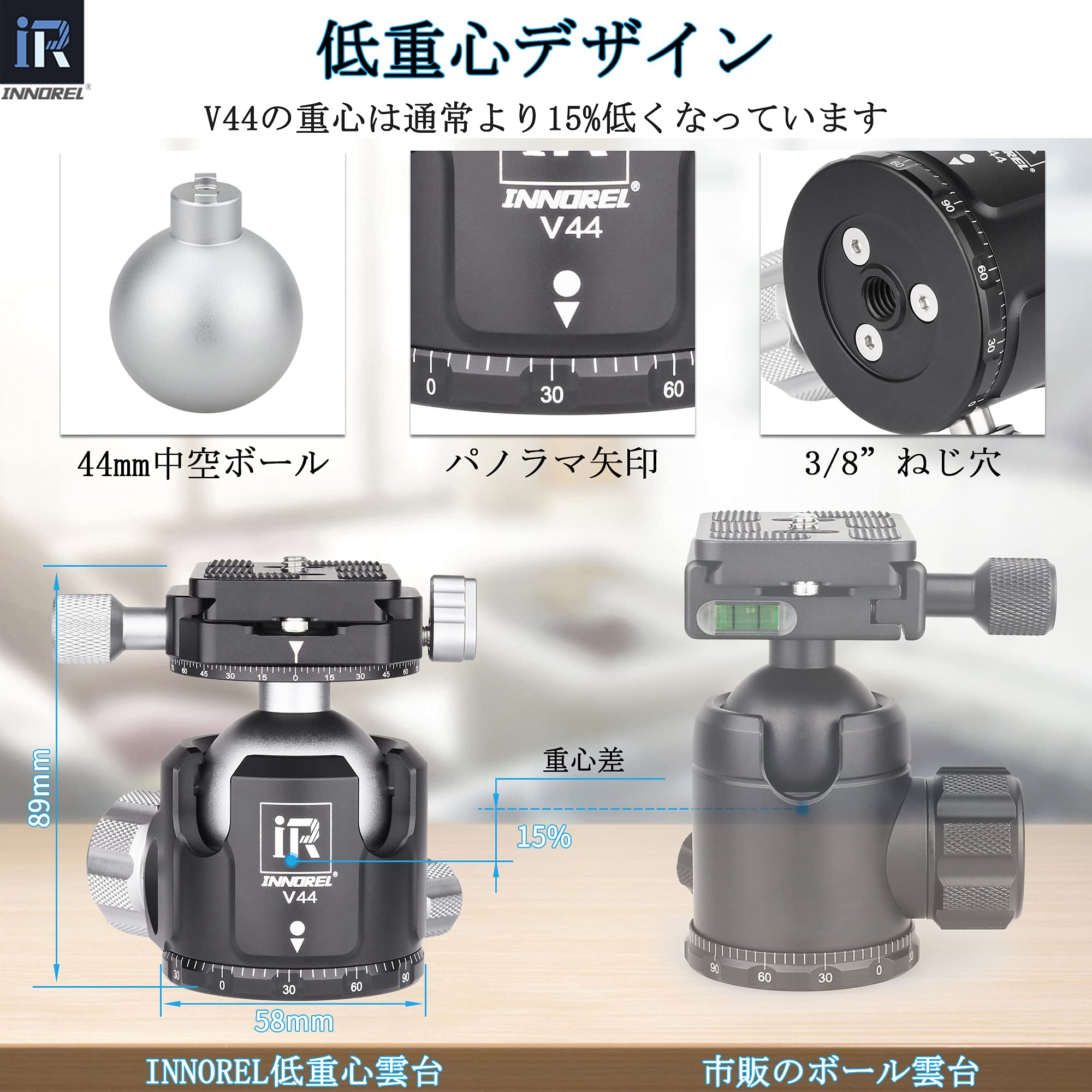 INNOREL 自由雲台 ボール雲台 微動雲台 Vシリーズ 低重心 耐荷重最大25kg ボールヘッド直径 44mm 強化 CNC アルミ合金 三脚 一脚 一眼レフ 撮影 DSLR ビデオカメラ用 360度回転 パノラマ 3/8