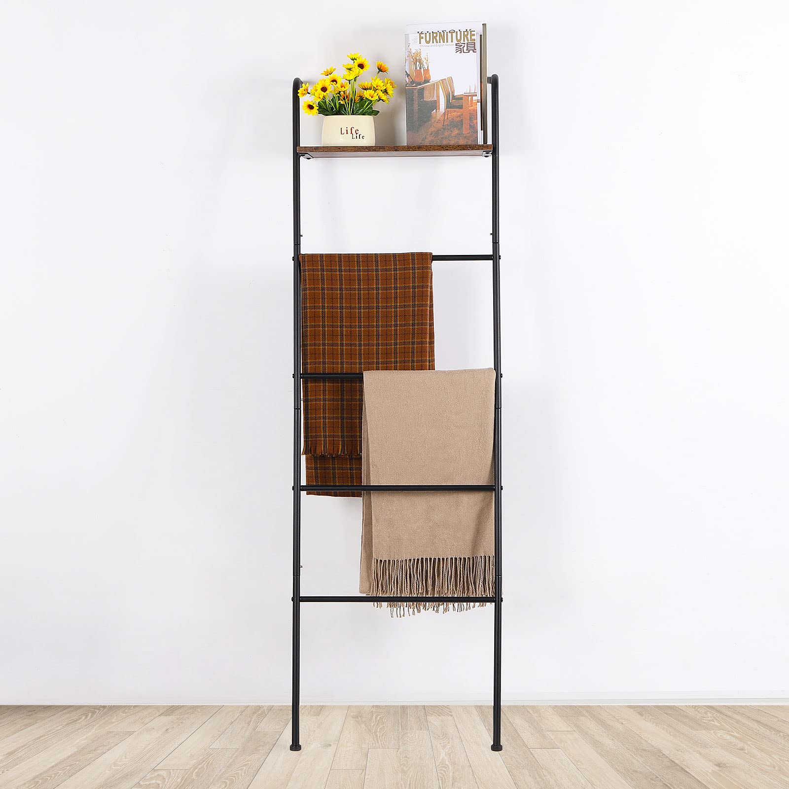 LIANTRAL ブランケットラダー、壁掛けタオルはしご ブランケットホルダーラック 木製棚付き リビングルーム/バスルーム用 ブランケット用装飾はしご (5段、ブラック)