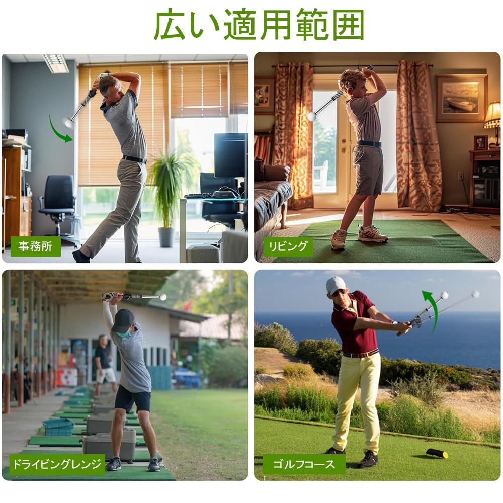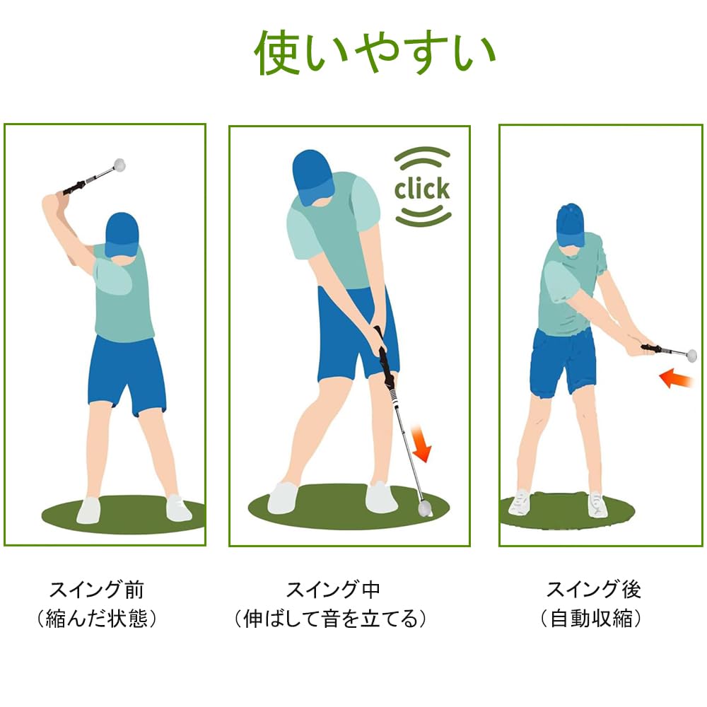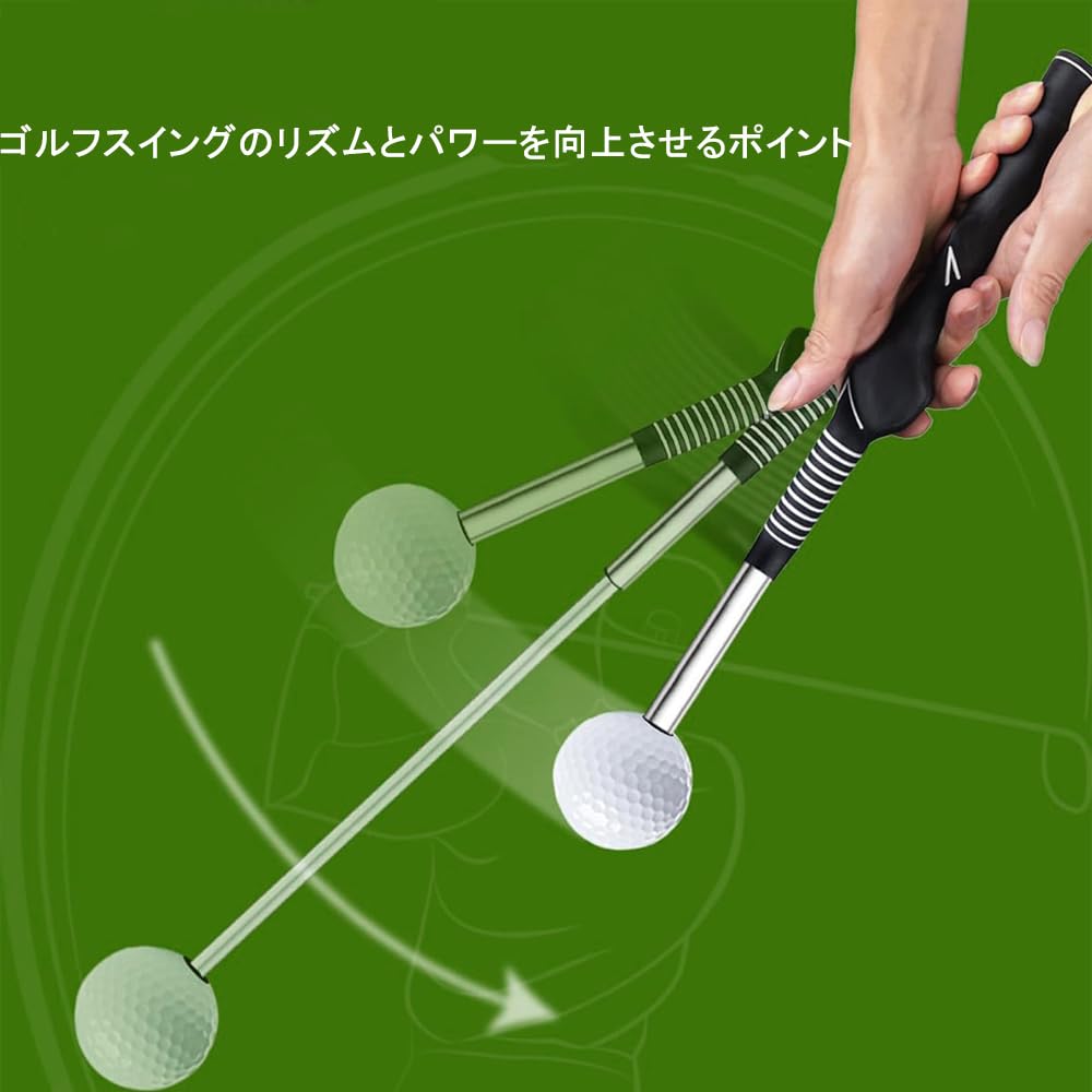 このゴルフスイング練習器は伸縮可能なデザインを採用しており、展開時の全長は約66cm、収納時は約39cm、重量は約316gとなっています。