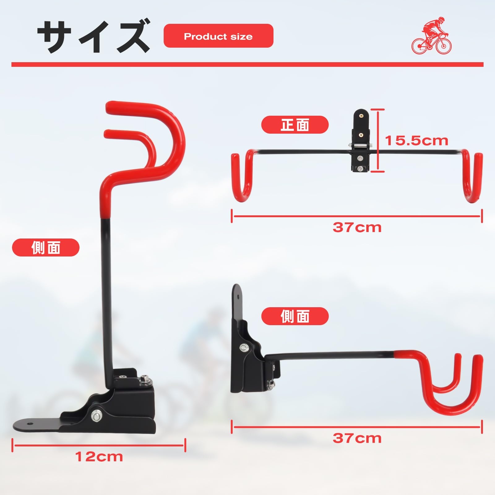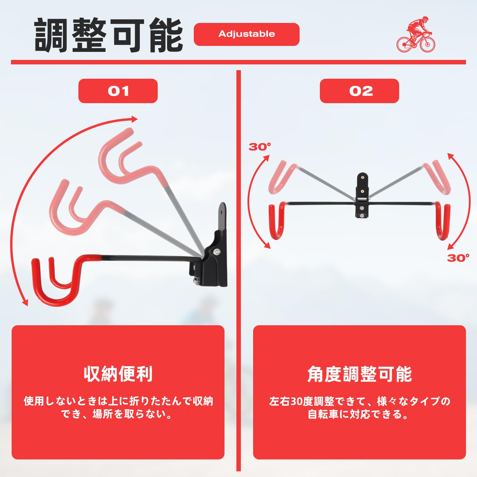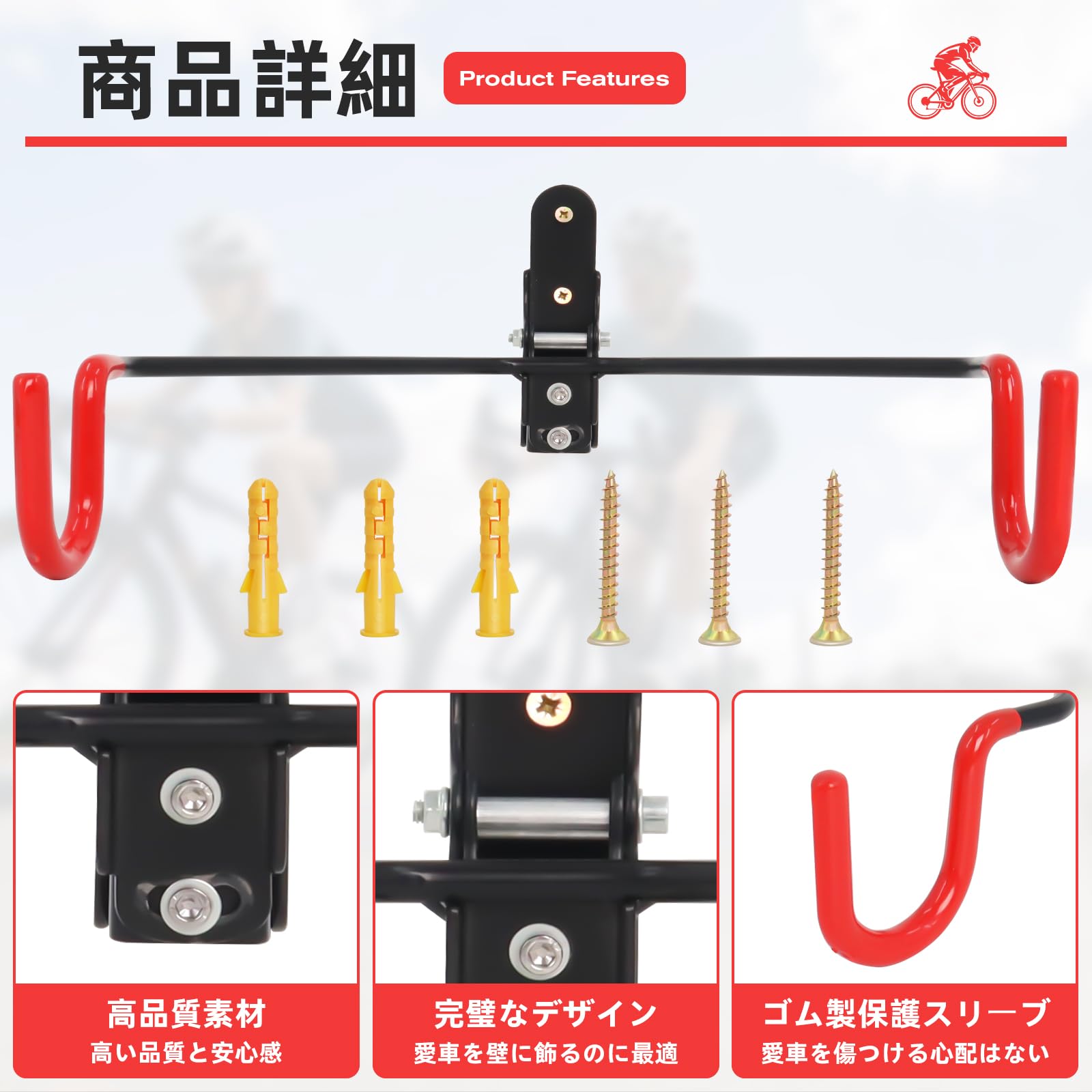 【製品の詳細】 材質:スチール、ラバー耐荷重制限:30kgまで(壁の構造による)特長 ①使用しない時は、コンパクトに折り畳み可能です。スペースを節約します。 ②フックは柔らかいスポンジで覆われており、バイクを傷から守ります。粉体塗装が自転車のフックを滑らかに保ち、錆を防ぎます。 ③大切な自転車を室内で、保管でき、盗難等から守れます。④左右のフックの角度を変更して、30°が調整できて、さまざまなタイプの自転車に対応できます。 幅広い ①この製品は広く使用されており、マウンテン自転車、オフロード自転車、折りたたみ自転車などのすべての自転車に適しているだけではありません。 また、オートバイのヘルメットとギターを展示することもできます。②家をきれいに保つのに役立ちます、清潔でスタイリッシュに見えます。すごくお洒落です。
