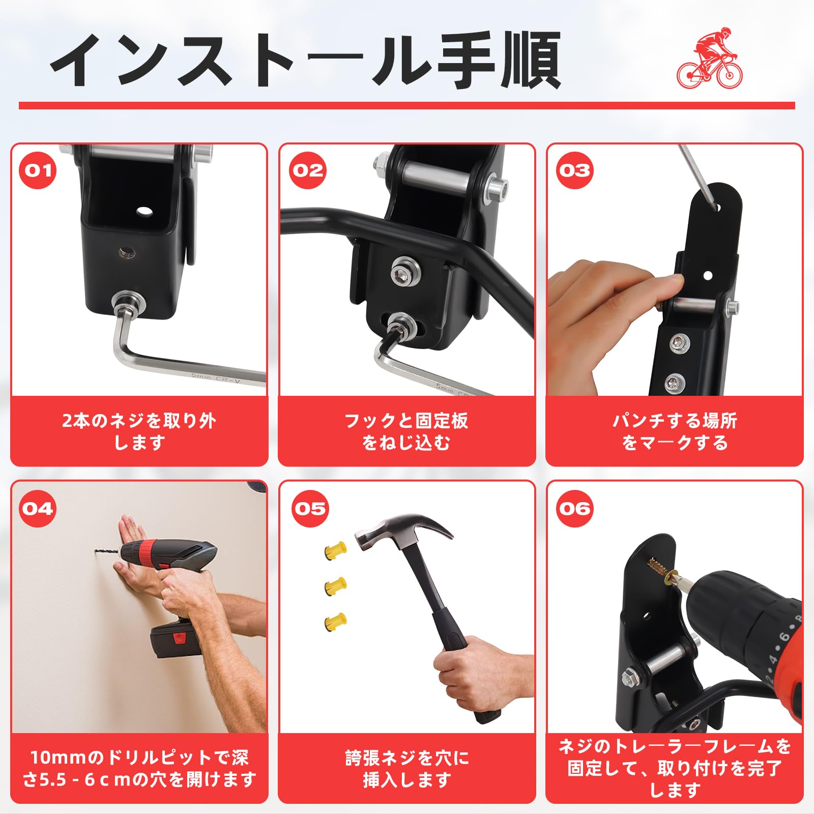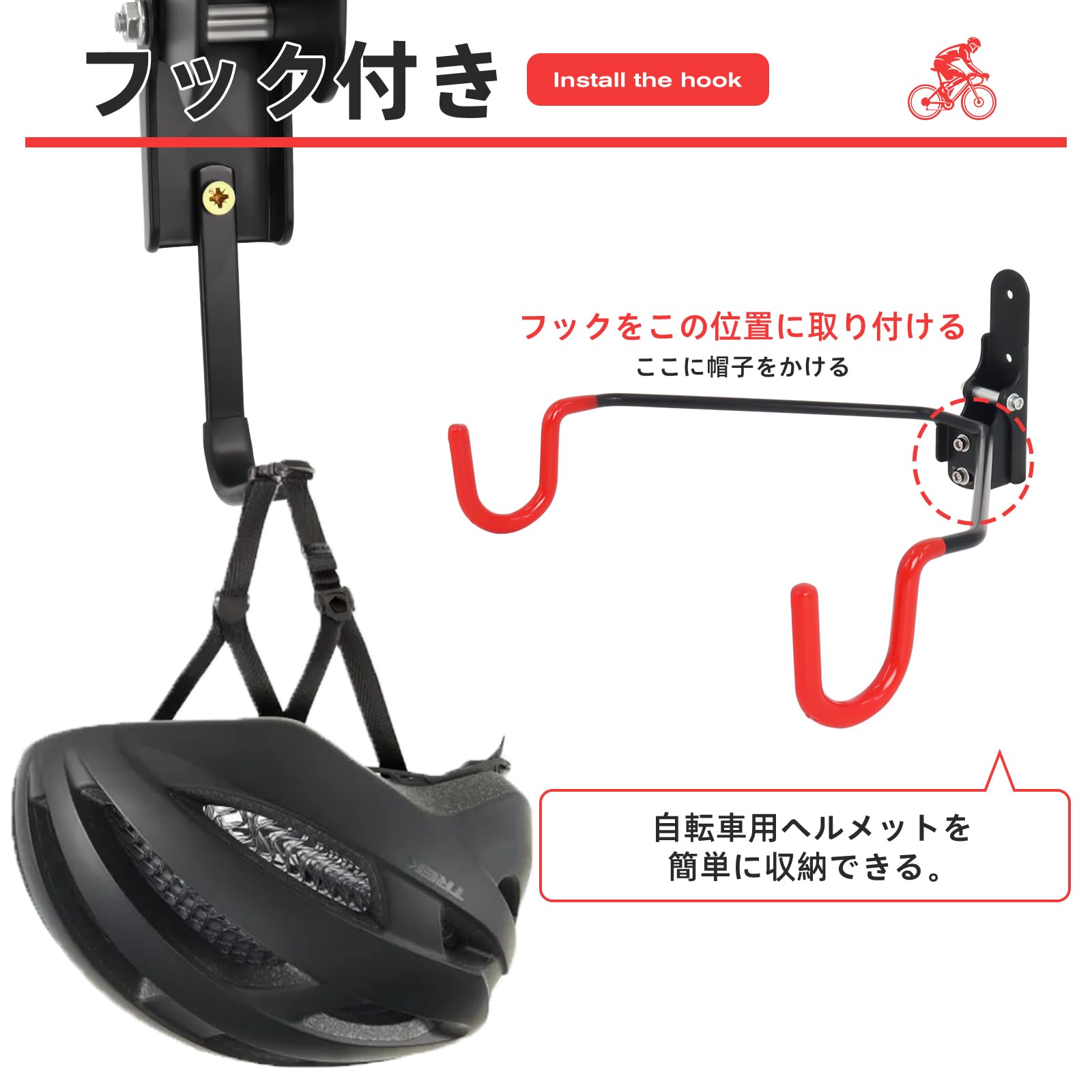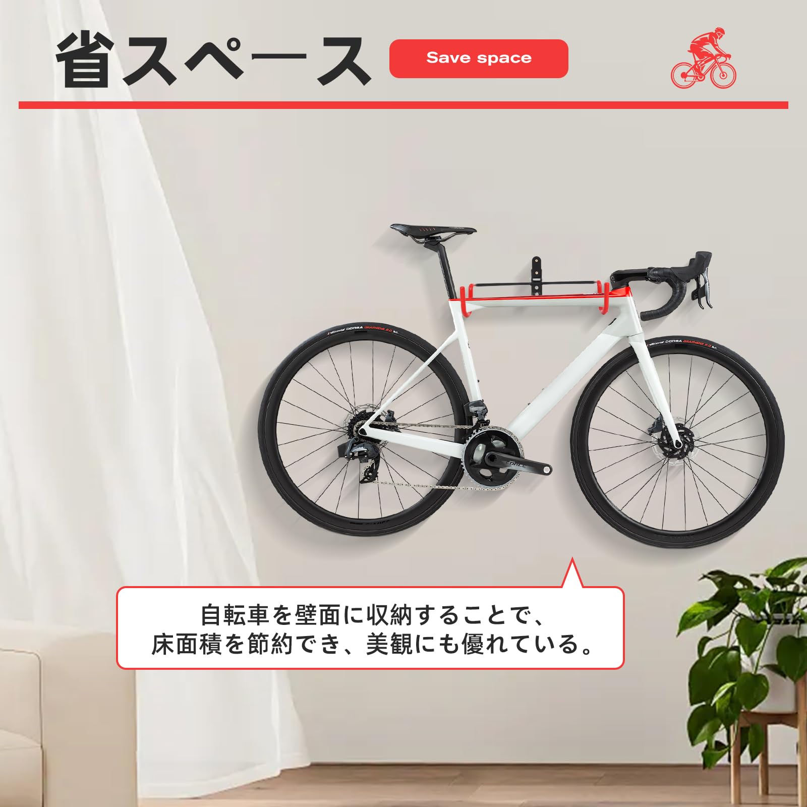 【製品の詳細】 材質:スチール、ラバー耐荷重制限:30kgまで(壁の構造による)特長 ①使用しない時は、コンパクトに折り畳み可能です。スペースを節約します。 ②フックは柔らかいスポンジで覆われており、バイクを傷から守ります。粉体塗装が自転車のフックを滑らかに保ち、錆を防ぎます。 ③大切な自転車を室内で、保管でき、盗難等から守れます。④左右のフックの角度を変更して、30°が調整できて、さまざまなタイプの自転車に対応できます。 幅広い ①この製品は広く使用されており、マウンテン自転車、オフロード自転車、折りたたみ自転車などのすべての自転車に適しているだけではありません。 また、オートバイのヘルメットとギターを展示することもできます。②家をきれいに保つのに役立ちます、清潔でスタイリッシュに見えます。すごくお洒落です。