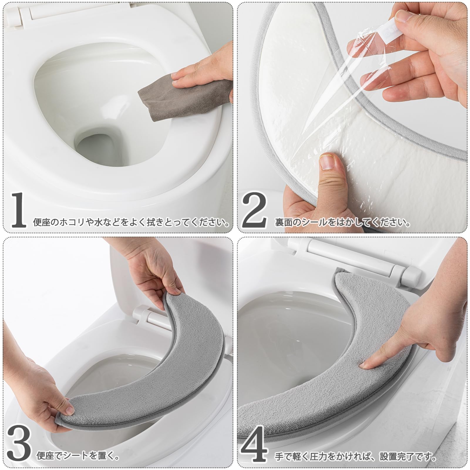 ★取リ外す際、便座に接着部分が残った場合は、ぬるま湯で湿らせた布を使用して拭き取ってください。
