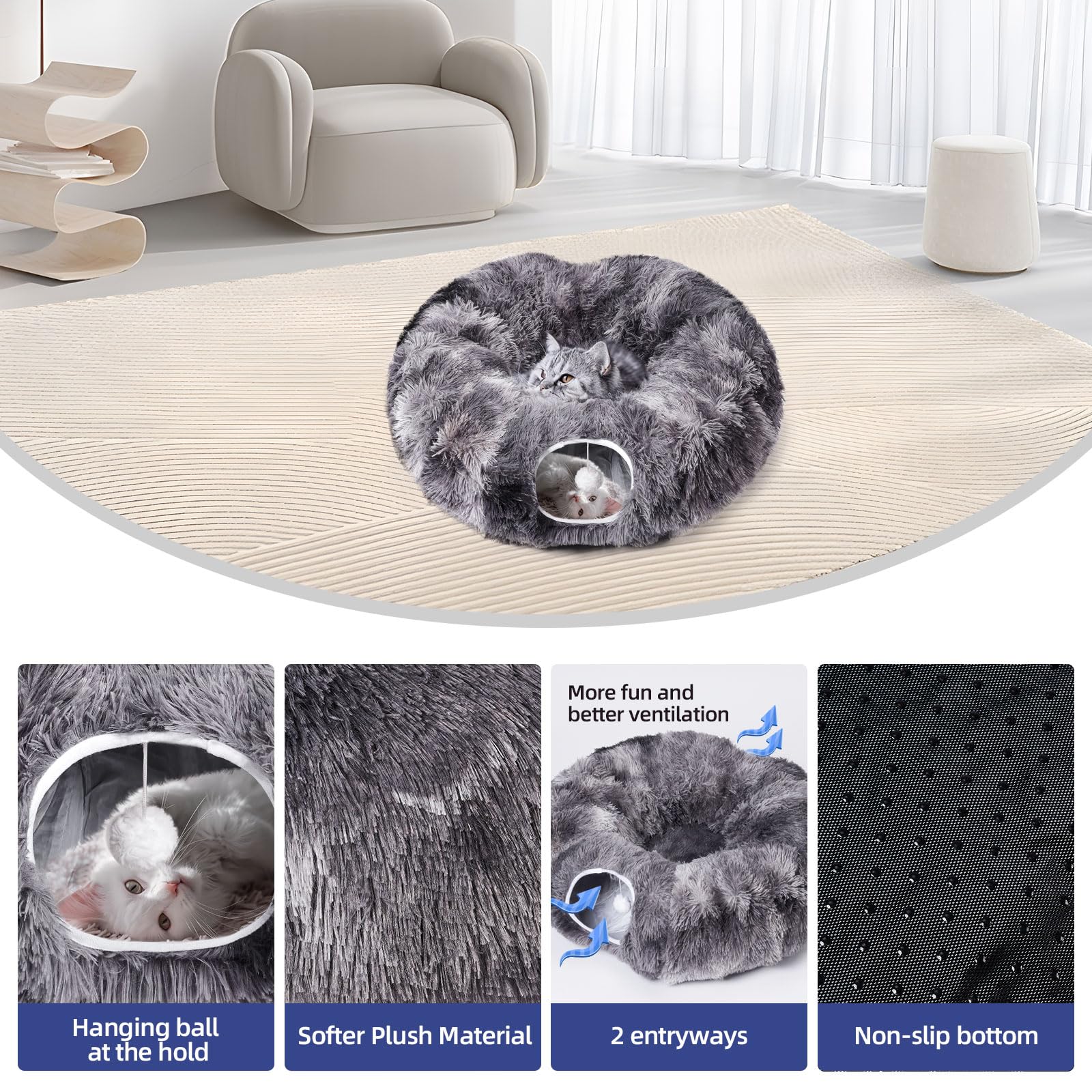 Avont 猫 トンネル ベッド 洗濯可能のクッション付き 折りたたみ 大型猫 トンネルチューブおもちゃ 3つの形状で遊べる 子猫 子犬 フェレット ふわふわ猫ベッド付き - ベージュ