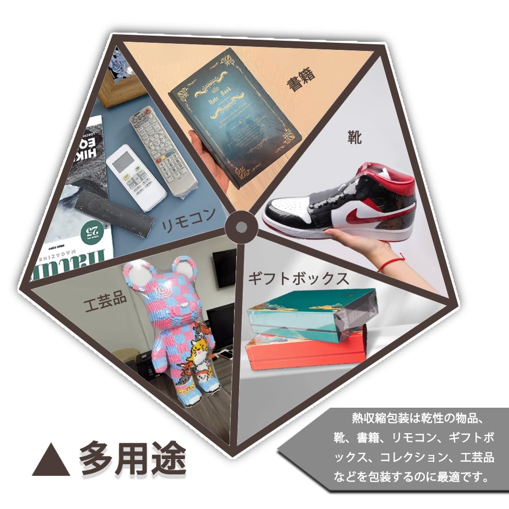 このリモコンケースは透明なPVC製のプレミアム素材を使用しており、安全で無毒、無味、環境と健康を兼ね備えています。厚さで破れにくく、最高のパフォーマンスを発揮します。価値のある大切なスニーカーや漫画本などをお守りします。コレクション用のスニーカーの保護、防塵に重宝し、シュリンクのコツを掴めば、スニーカーショップと遜色ない仕上がりになります◎ また、ネットショップやフリマアプリなどの商品発送用に包装すれば見栄えもアップし受け取り側の満足度も変わります。