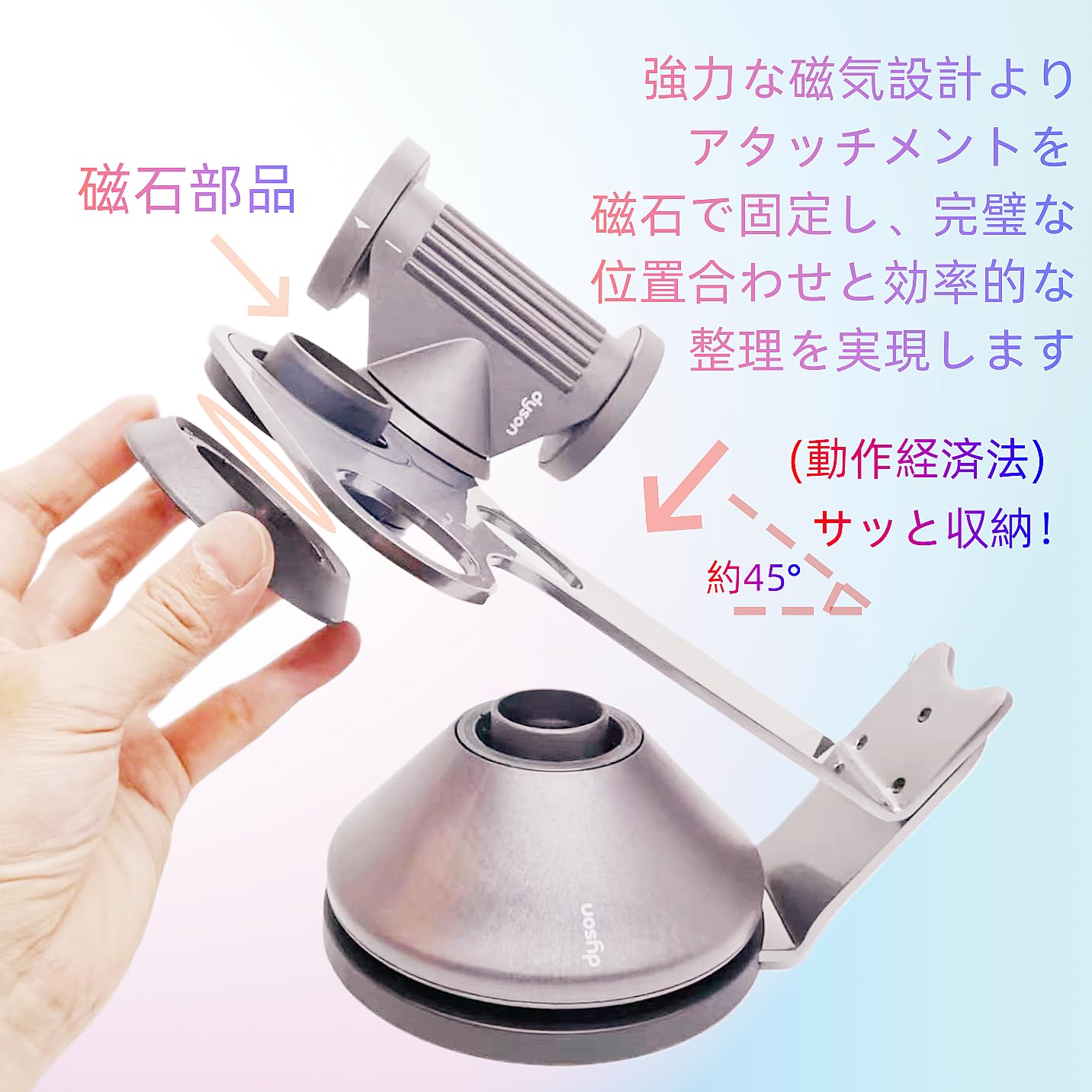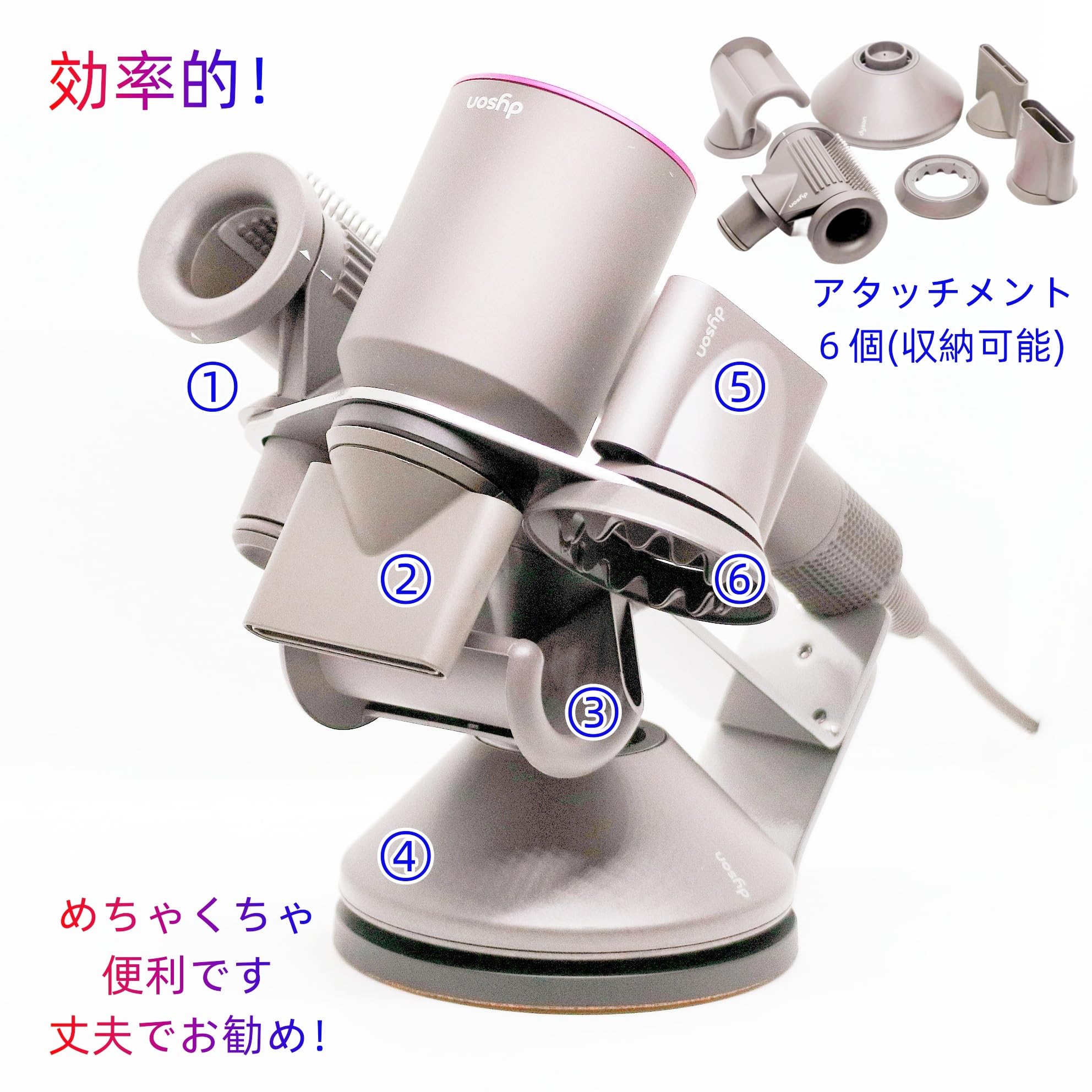 製品特徴:アタッチメント6イン1収納可能!磁石部品や滑り止めの材質が施され、本体を傷つける心配もありません、ドライヤー本体を45°で掛ける(磁石で吸着)だけ、サッと取りたし、サッと収納 (動作経済法) !