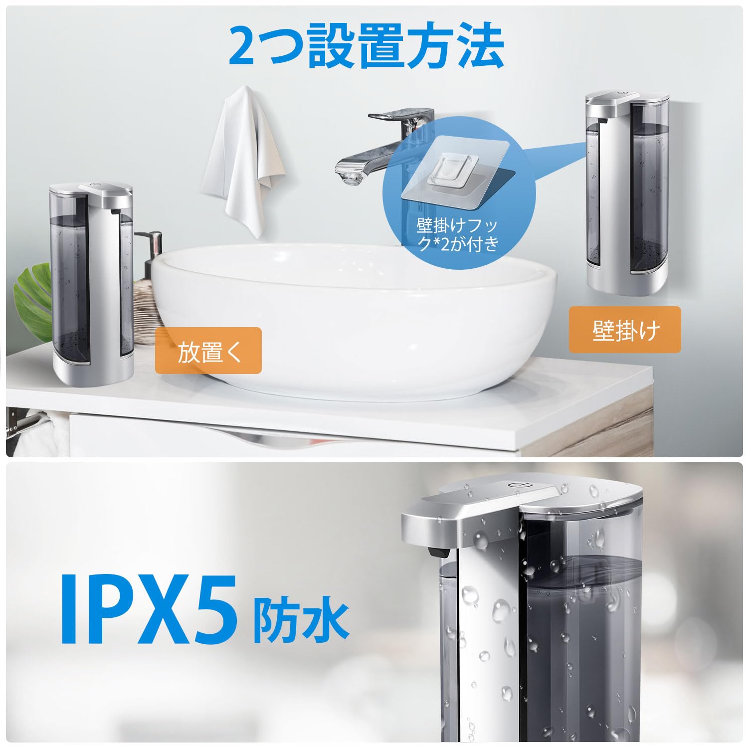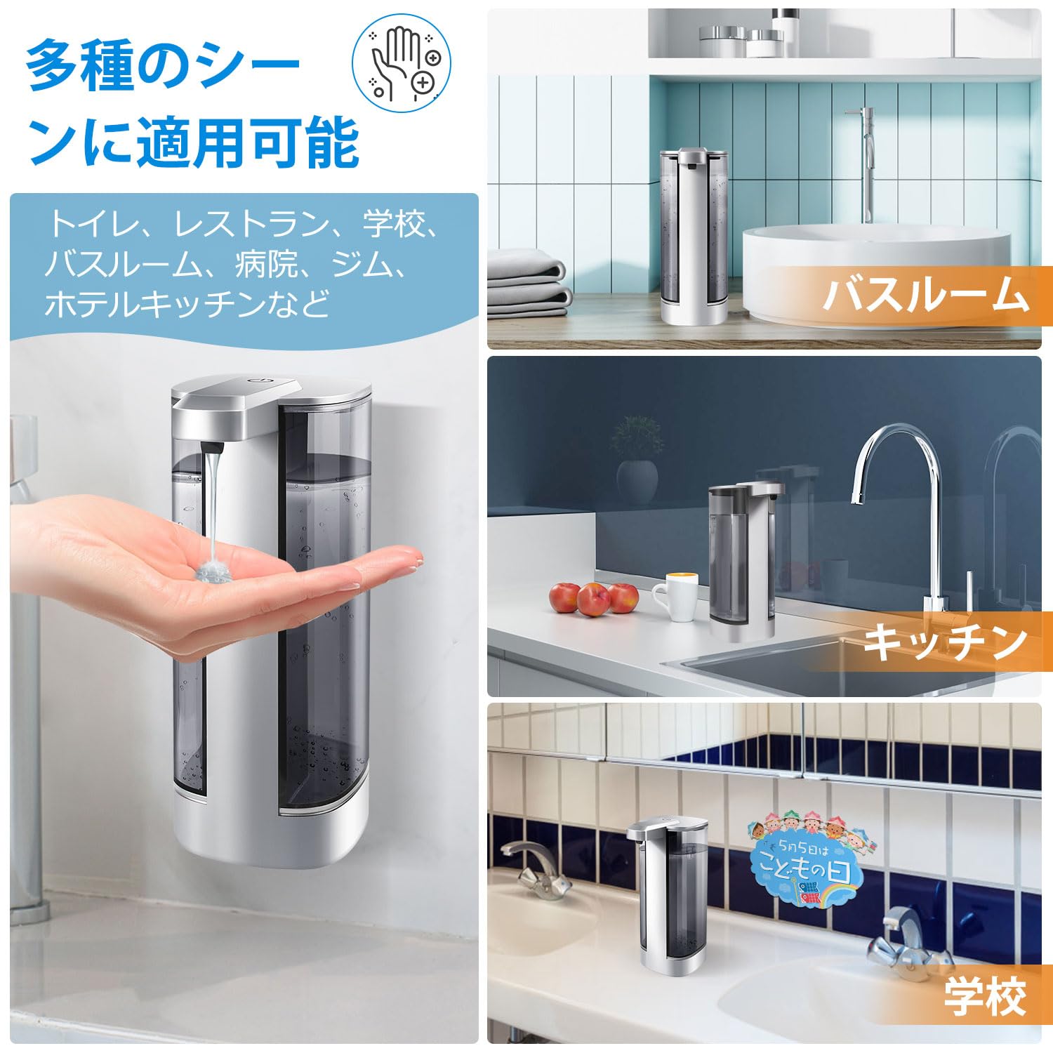 Varluckiner ソープディスペンサー ハンドソープ オートディスペンサー 自動 泡 380ml 吐出量4段階調节 壁掛け 充電式 キッチン 洗面所などに適用 日本語説明書付き
