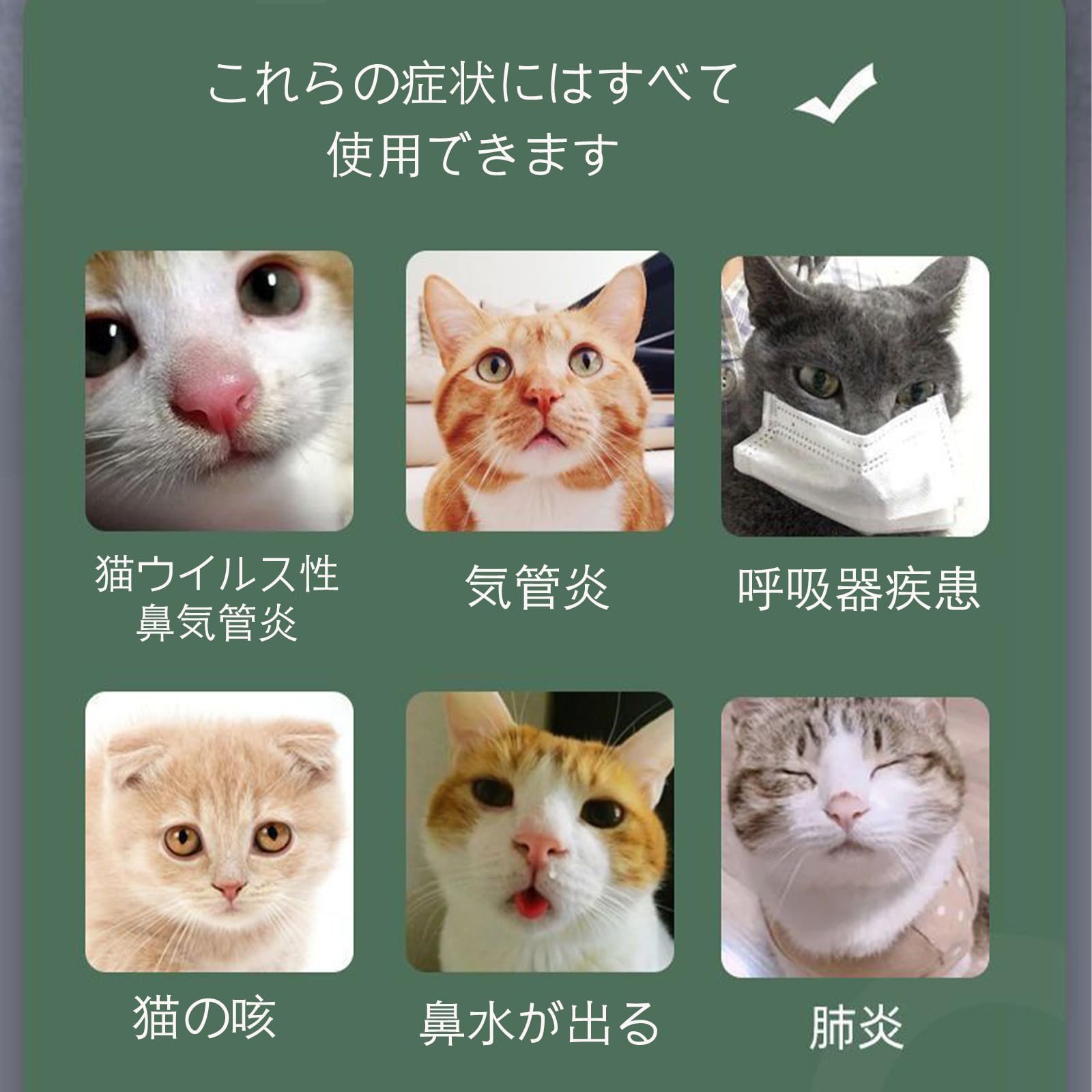 効果的に咳、鼻汁、などの呼吸器症状に対応し、ペットの呼吸器の健康を守る。