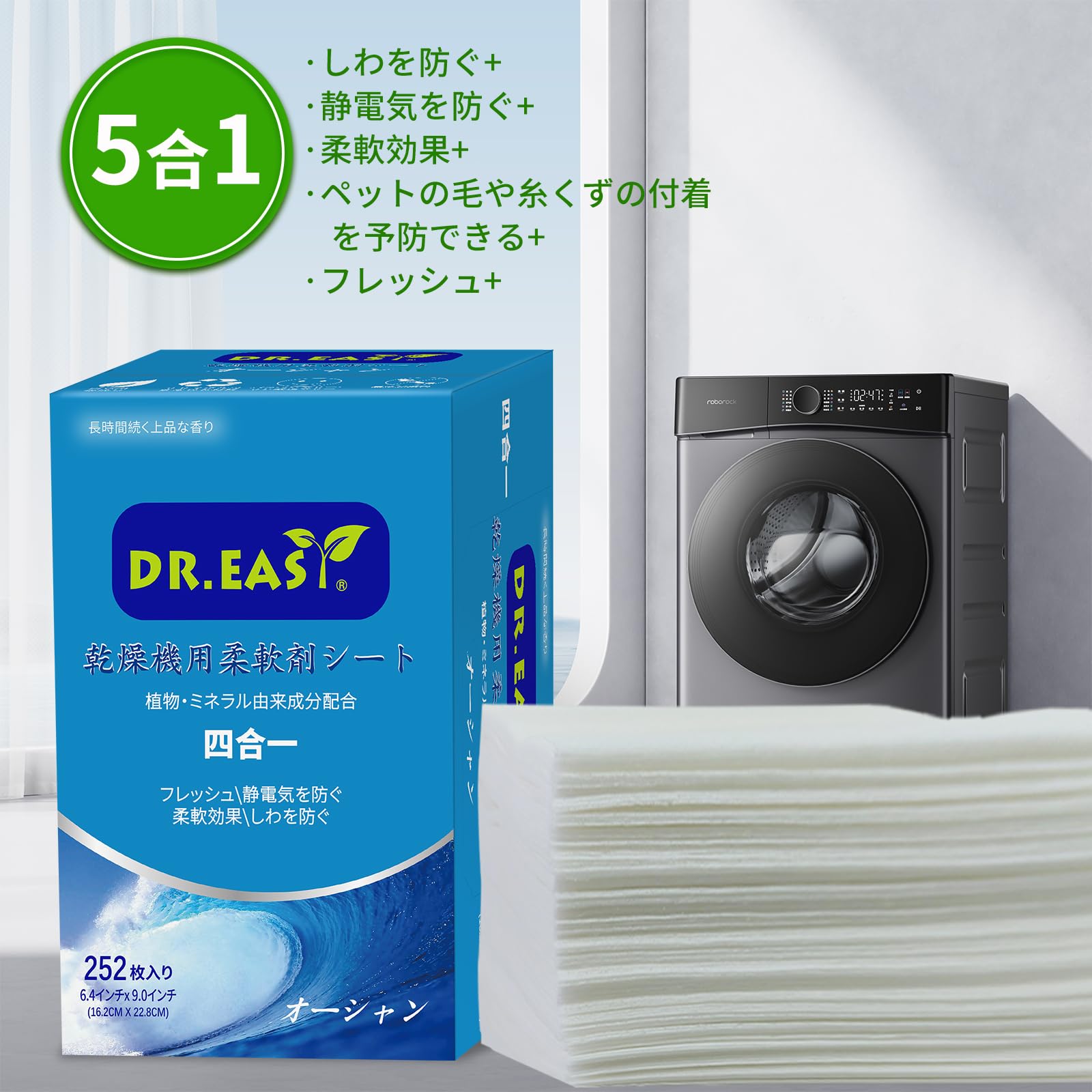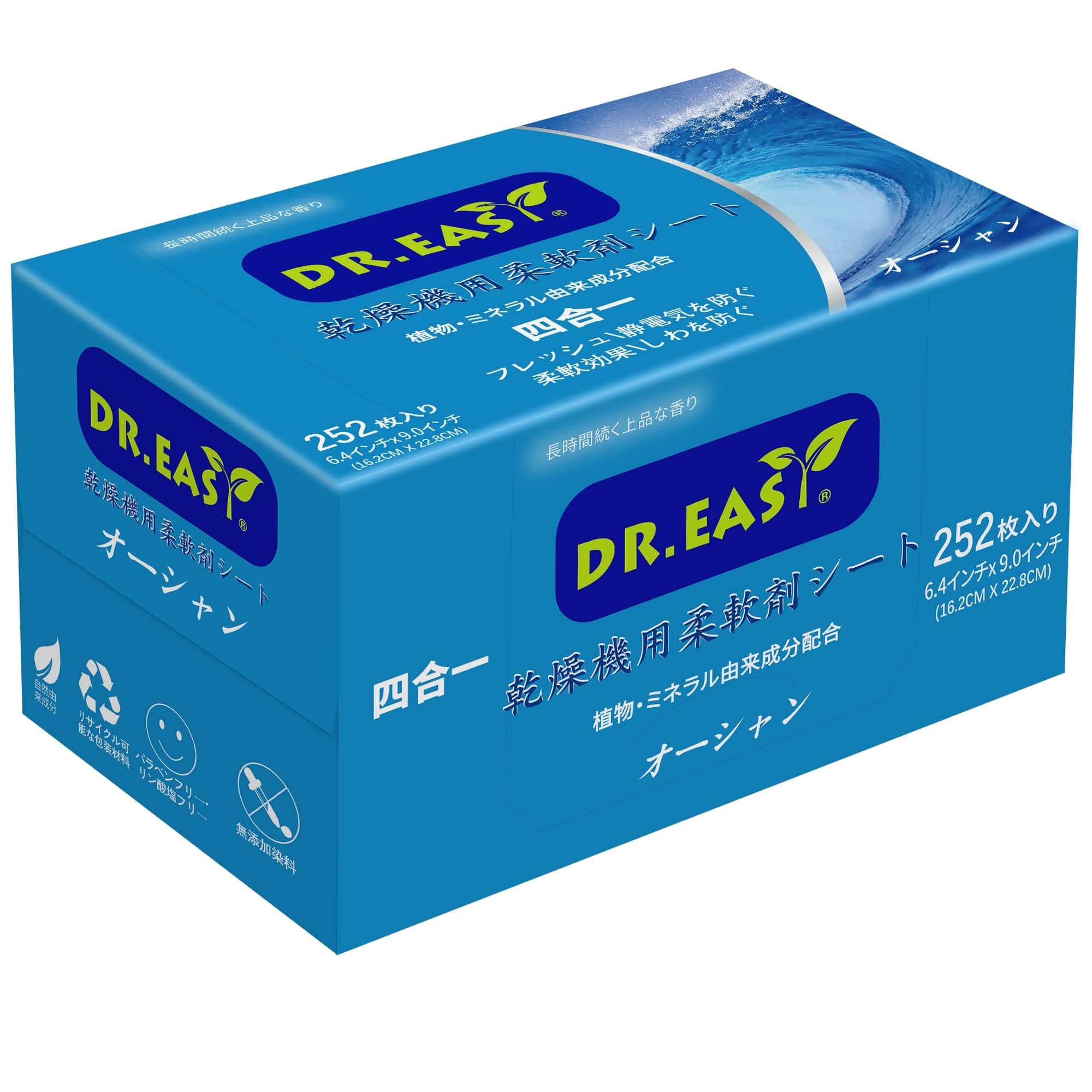 DR.EASY乾燥機用柔軟剤シート 植物由来成分 252枚入り オーシャン エッセンシャルオイル 香りのある 人工香料不使用 無染料 静電気防止 しわを防ぐ ペットの毛や糸くずの付着を予防できる