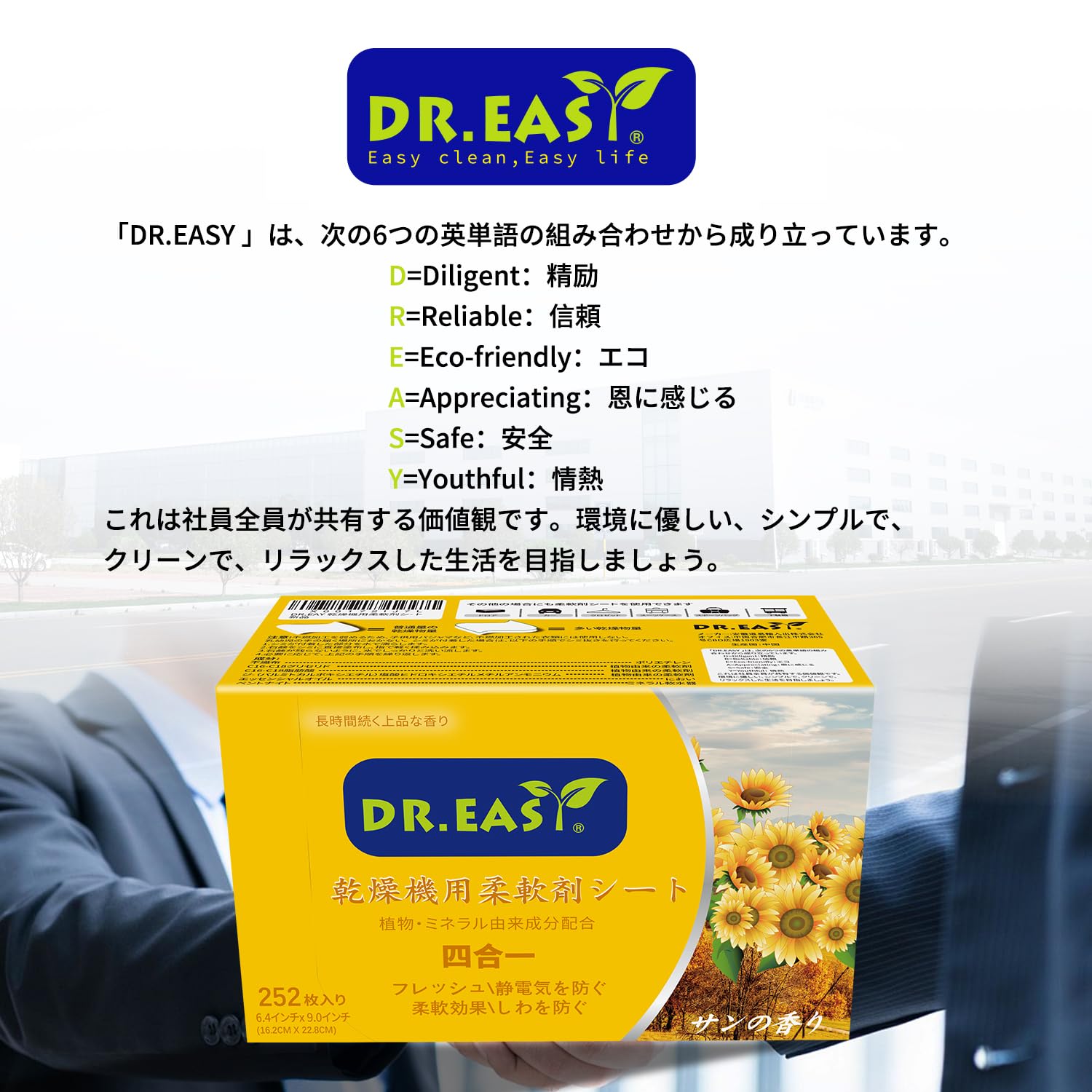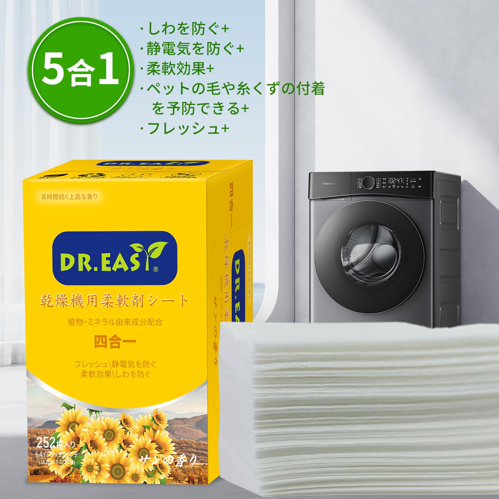 DR.EASY乾燥機用柔軟剤シート 植物由来成分 252枚入り フリー&クリア エッセンシャルオイル 香りのある 人工香料不使用 無染料 静電気防止 しわを防ぐ ペットの毛や糸くずの付着を予防できる