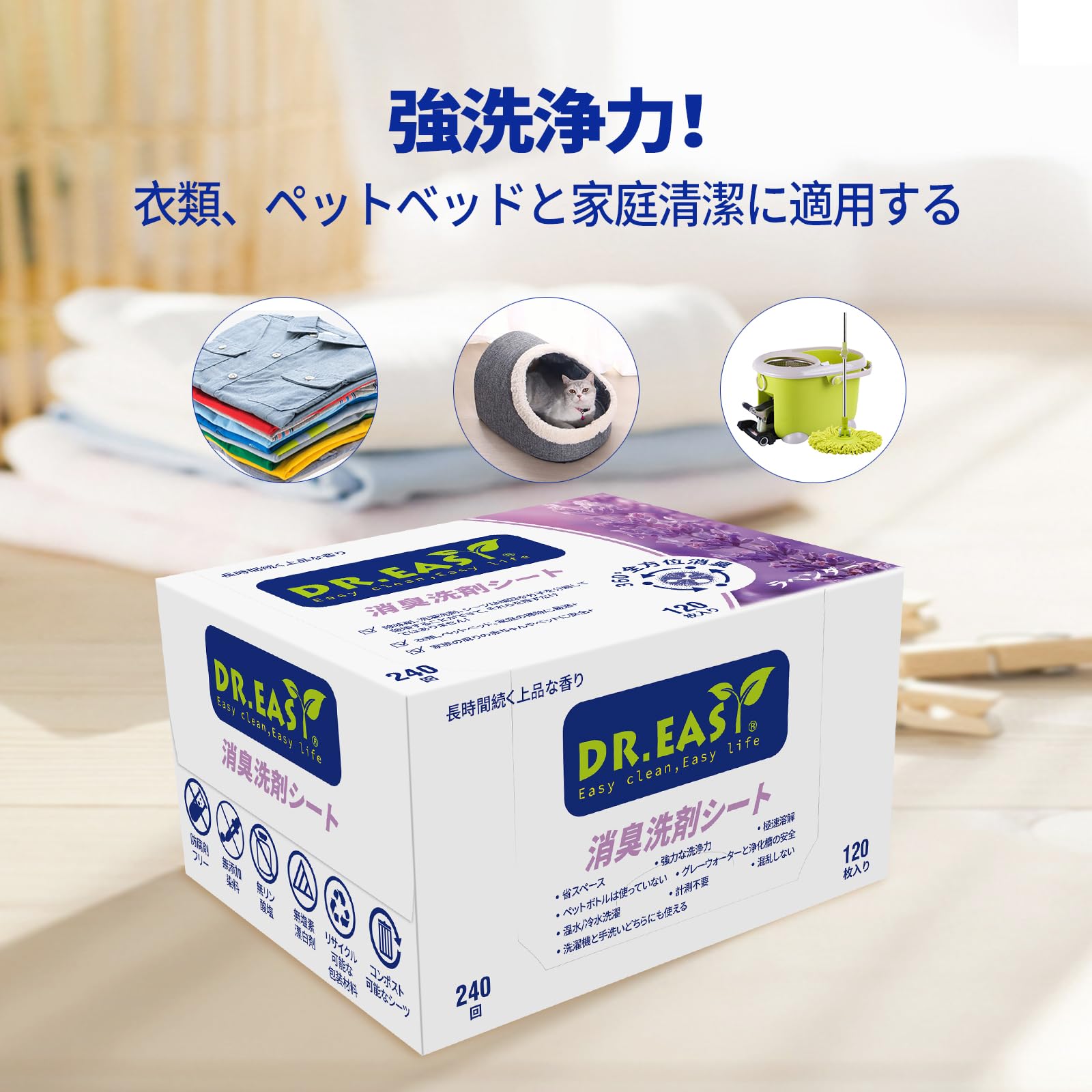 DR.EASY消臭洗剤シート 240回分 ラベンダー 持ち運びが簡単で旅行に最適 ペットの安全を守る 混乱しない 無染料 生分解性成分