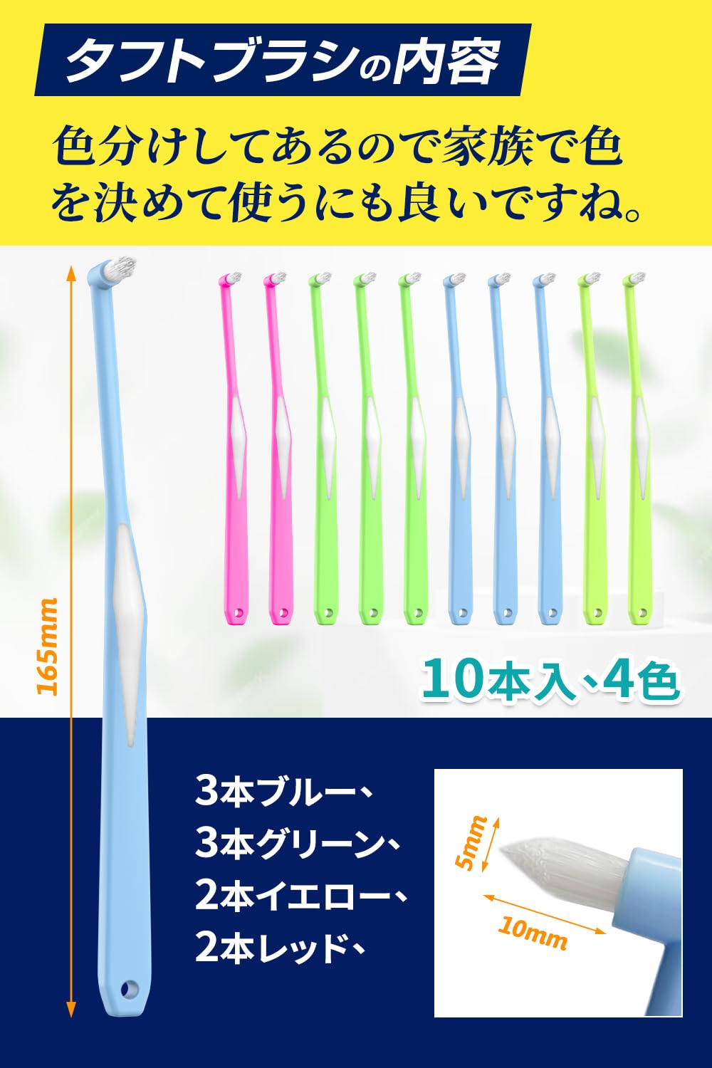 【タフトブラシの内容】15本入、5色(3本ブルー、3本グリーン、3本イエロー、3本レッド、3本ホフイト)。やわらかめポイント歯ブラシ 歯と歯の間や歯茎との境目などの汚れを撓るブラシがごっそり掻き出してくれますよ。ワンタフト 歯ブラシ 全長165mm、穴 毛の材質:PBT、ハンドル:ポリプロピレン