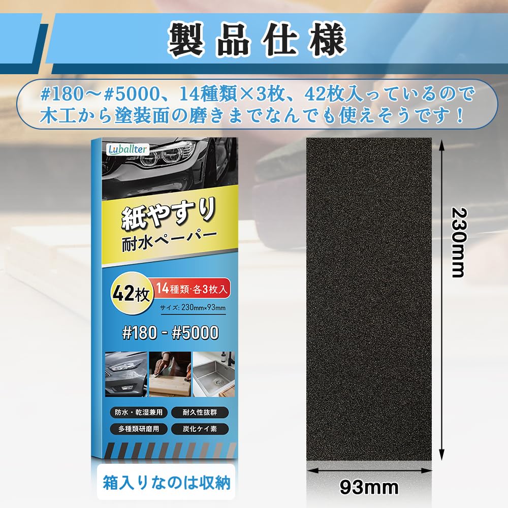 Luballter 紙やすり 42枚14種類 180~5000番 耐水ペーパー セット 研磨シート 230×93mm サンドペーパー (180 220 240 320 400 600 800 1000 1200 1500 2000 2500 3000 5000 各3枚入) 紙ヤスリ 耐水ヤスリ ヘッドライト磨き 金属 木工 DIY作業に キッチンの掃に