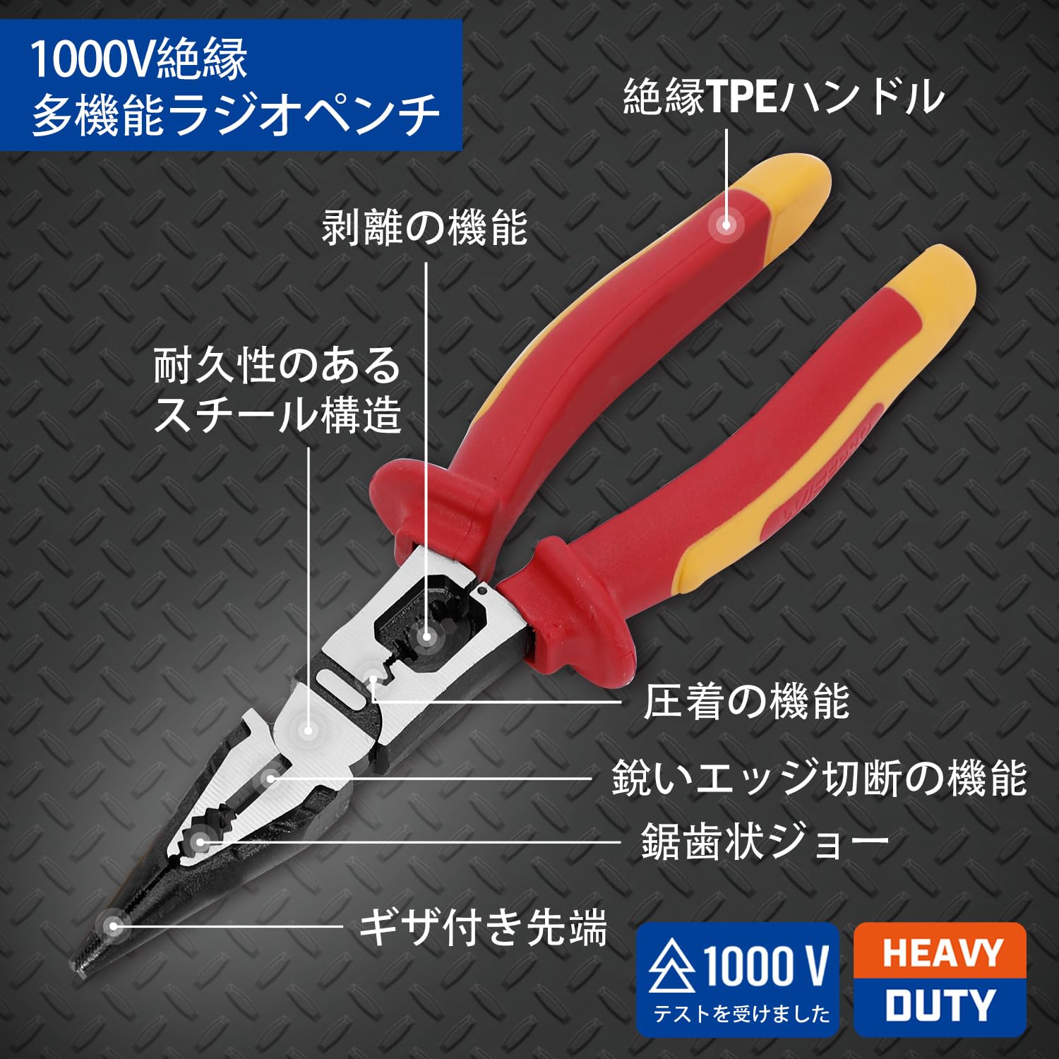 多功能:具有多功能性的无线电钳,是一款适用于电气设备工程接线作业的优质工具。 对于螺栓的拧紧、夹具、卷绕、断线、压接、剥离等多种作业来说很有帮助。 从家庭修理到工作现场广泛适用。 通过1000V高电压绝缘设计,兼具安全性,成为各种电气作业不可或缺的工具,对应各种作业需求。 对于电气工程师和专家来说,可以确保工作效率和操作安全性。 这款万能电工无线电钳的手柄由TPE绝缘材料制作而成。 无线电钳经过严格的1000V电压测试,在高电压环境下提供安全保护,确保可靠且安全的电力工作,降低触电的风险。 规格:全长225毫米、开口宽40毫米、重量:283克。 主体材质:55钢。 手柄材质:绝缘TPE。