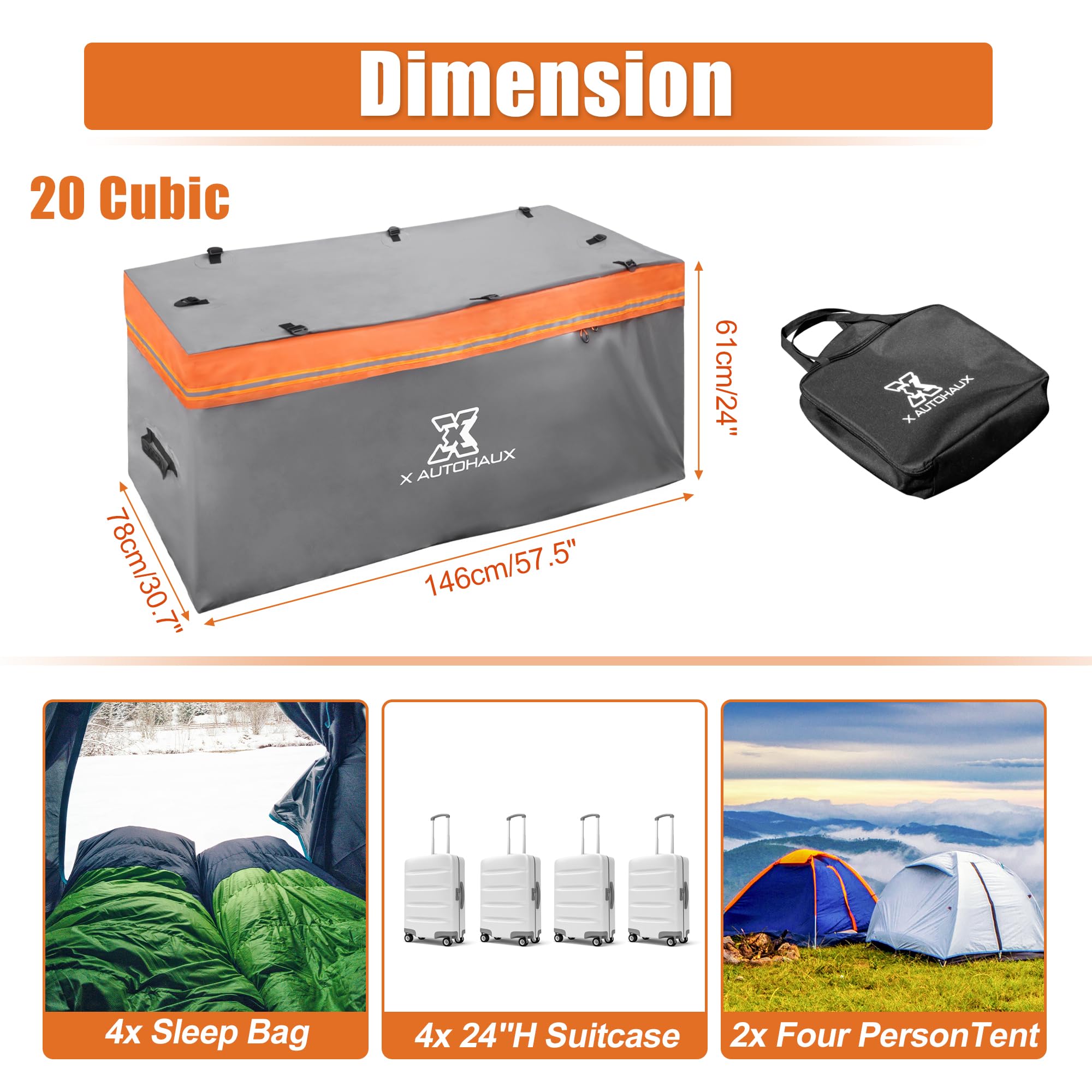 ルーフバッグは、車内の収納スペースの限られた問題を解決するために設計されました。25立方フィートのルーフトップカーゴキャリアは、4-6個のスーツケース、旅行用ラゲッジケース、テント、寝袋などを収納することができます。より快適な旅行のために車内スペースを解放します。
